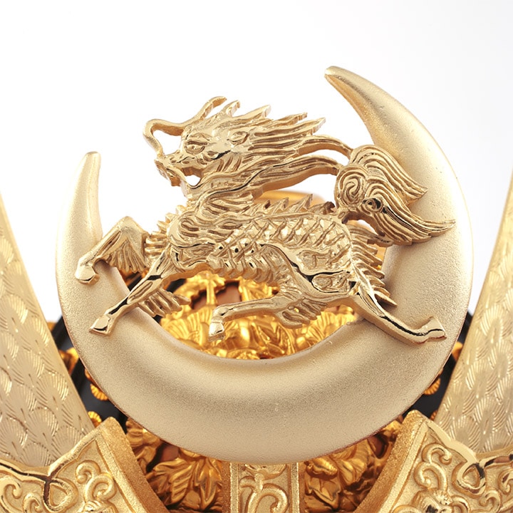 この麒麟児之兜は、才知に優れた少年のたとえである、『麒麟児』にあやかり、お子様が才知に優れた少年に育つことを願って、麒麟を前立てと屏風にあしらってております。