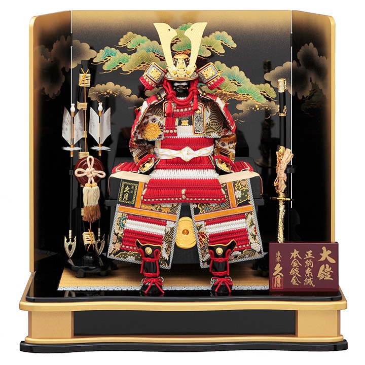 縅糸(おどしいと)は、紅白で縁起のいい鎧となっており、長寿の象徴である松と共に華やかなセットとなっております。