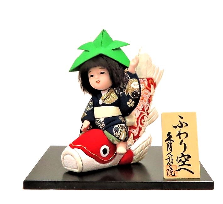 鯉にまたがり空高くを目指す、こどもの木目込み人形です。