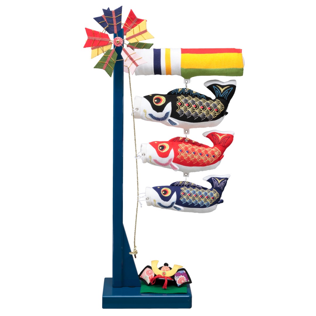 スタンドに配した愛らしい兜飾りもお祝いに相応しい、優美で華やかな仕立てが魅力の鯉のぼりです。