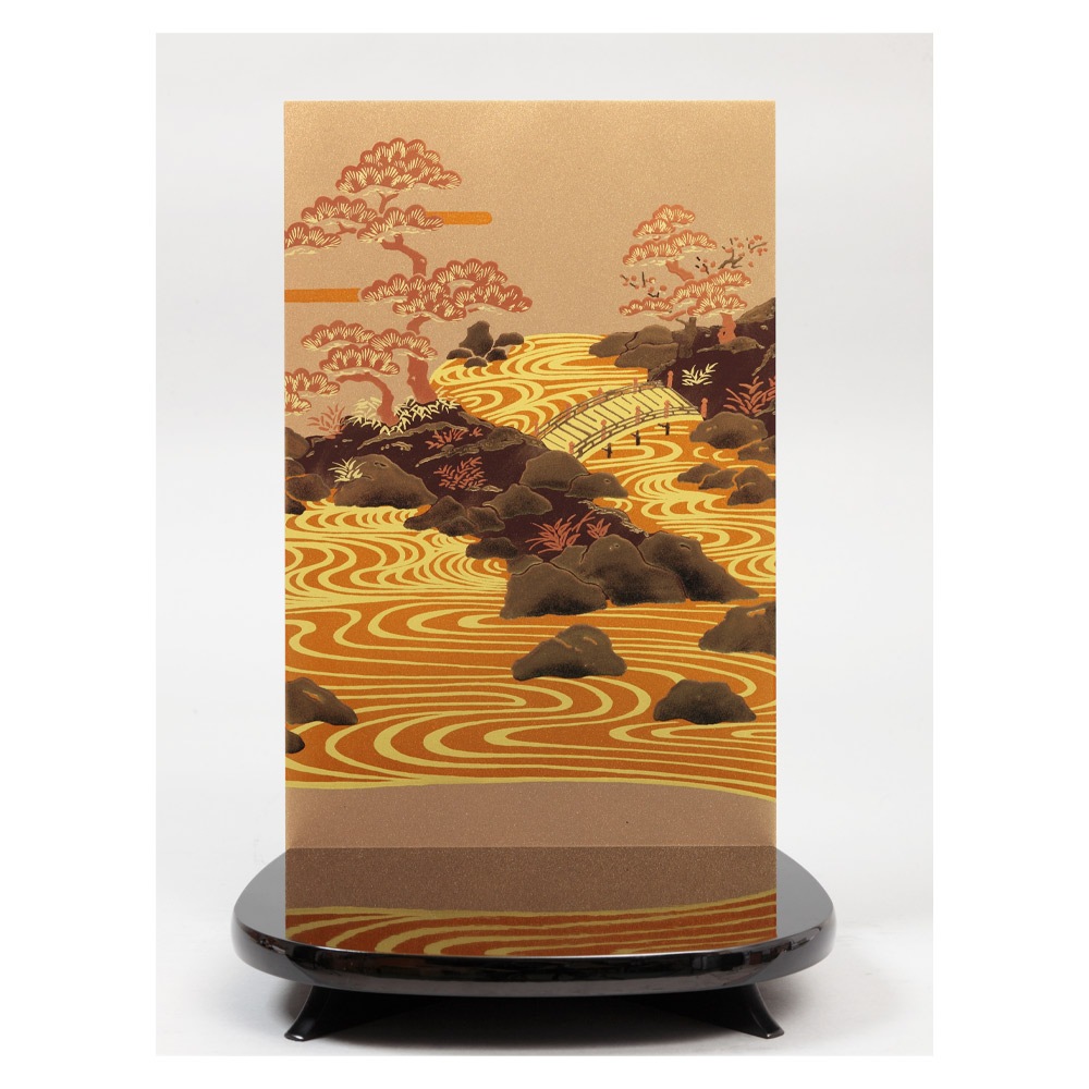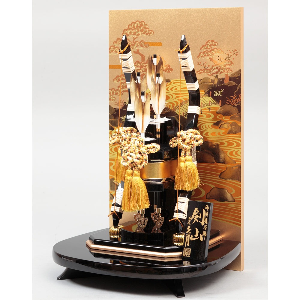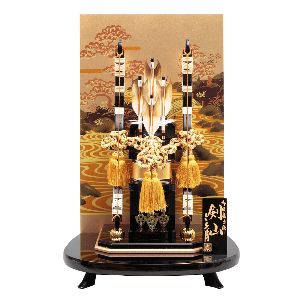 華やかな庭園を描いた衝立式の飾り台に、クラシカルな仕立ての破魔弓が見事に映えます。