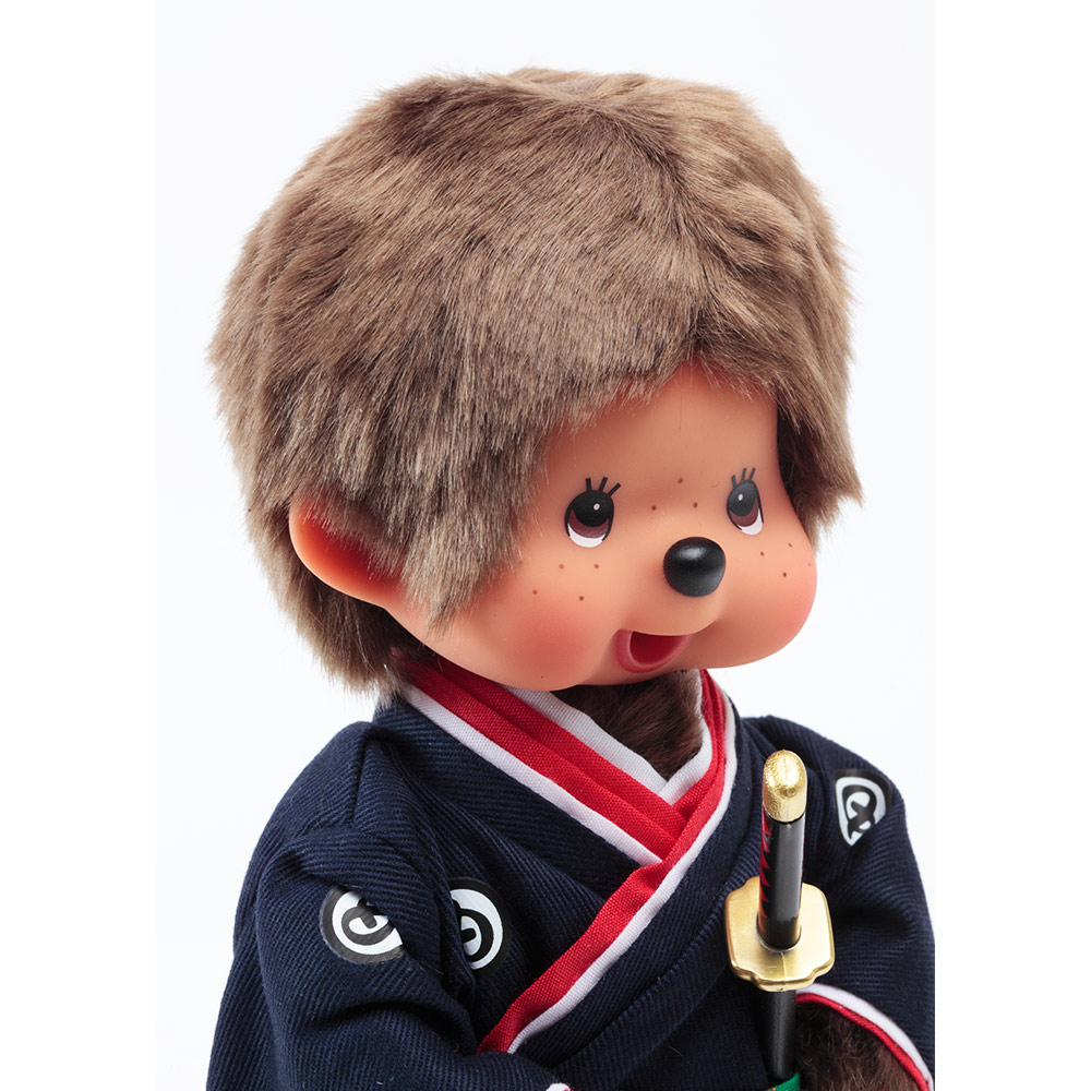 剣豪モンチッチは長い刀を腰に差し、紋付きの着物でキリリと格好よく決まっています。