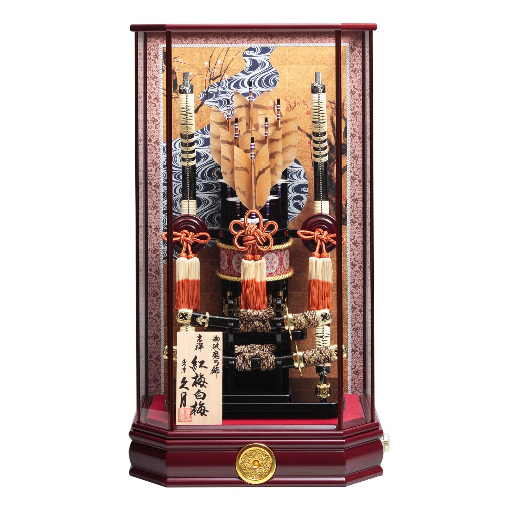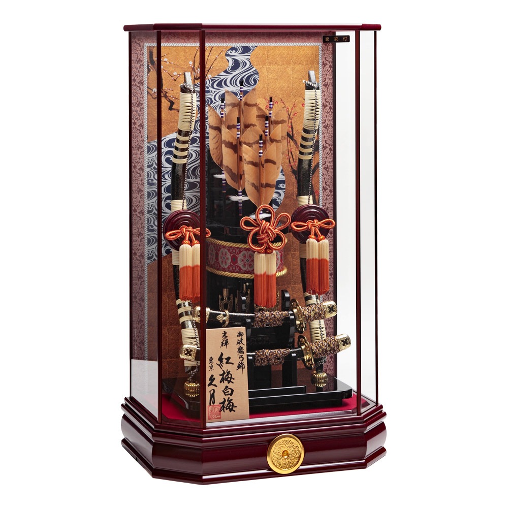 上品な色使いのワイン塗の六角ケースに、紅梅白梅の絵柄を合わせた格調高い破魔弓飾り。