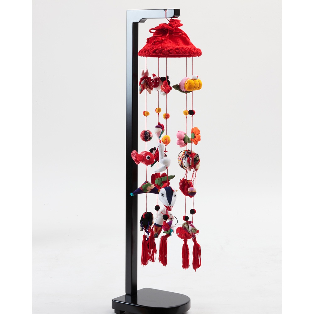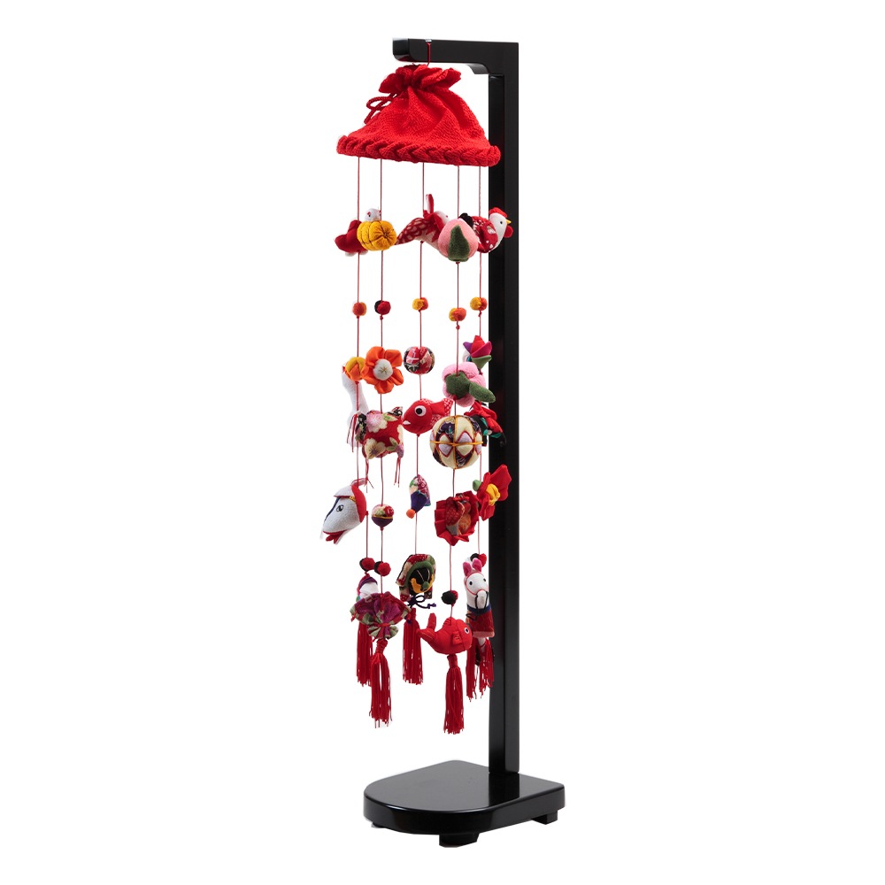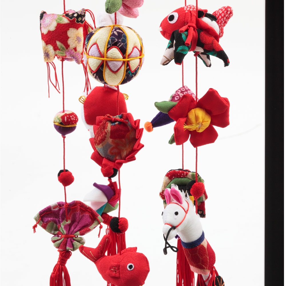 魔除けを意味する赤い傘布の下に、沢山のおめでたい飾りを下げた華やかなつるし雛。