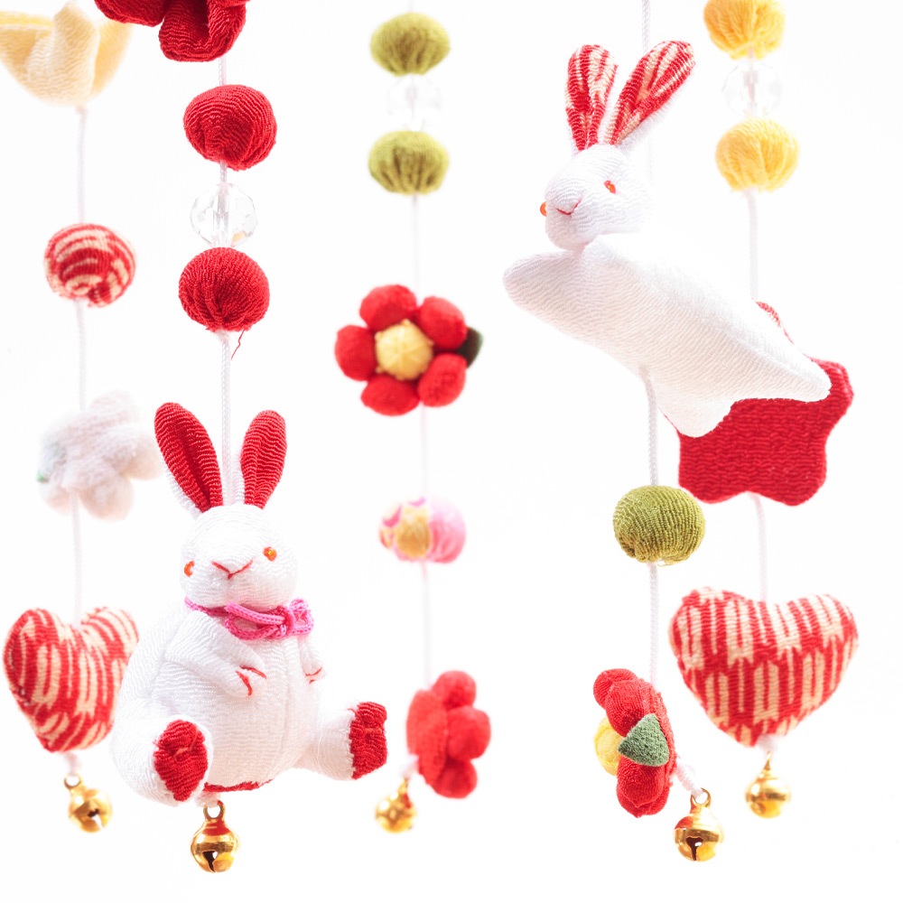 春の象徴や無病息災の意味を持つ"うさぎ"の飾りが沢山あしらわれた、華やかで可愛らしいつるし雛。
