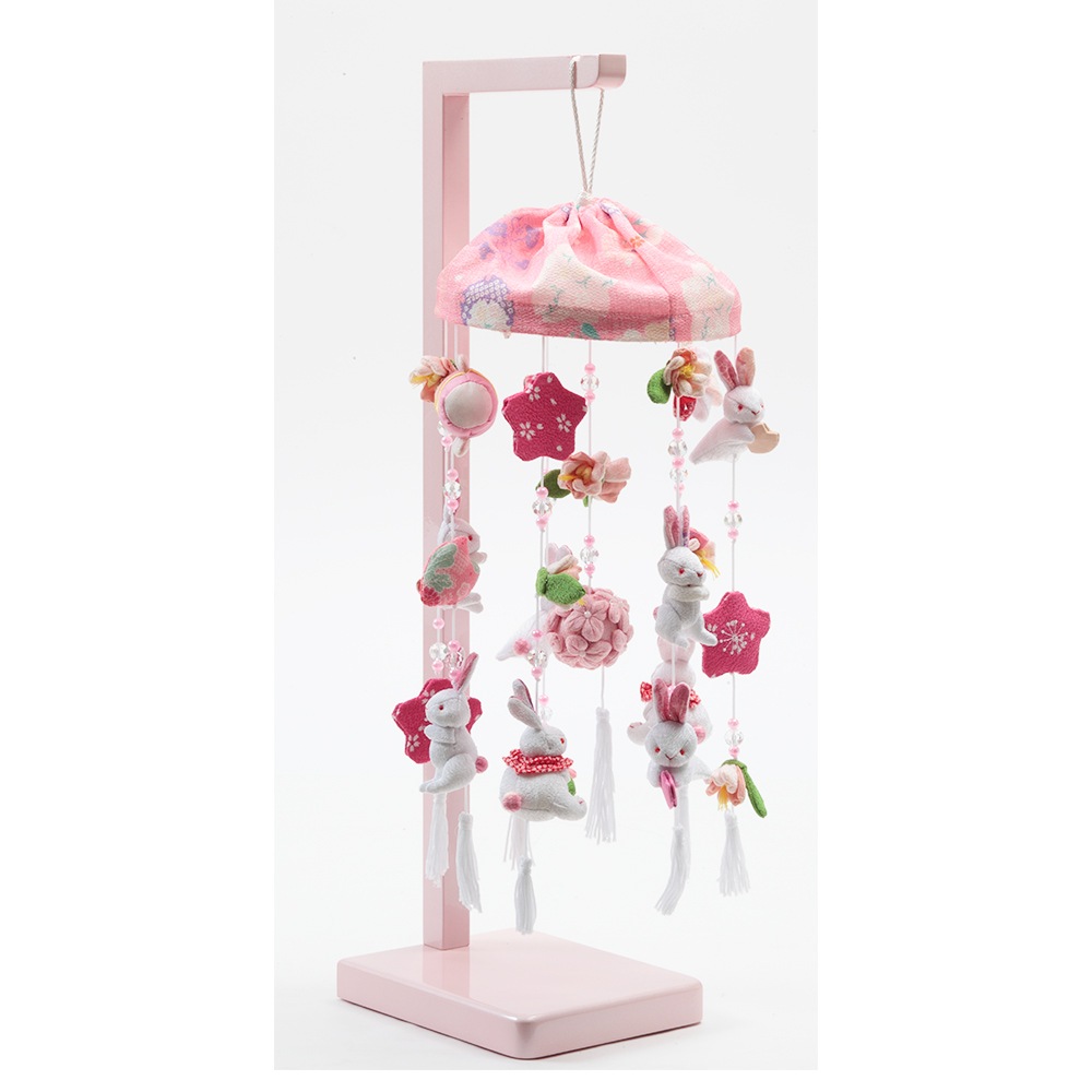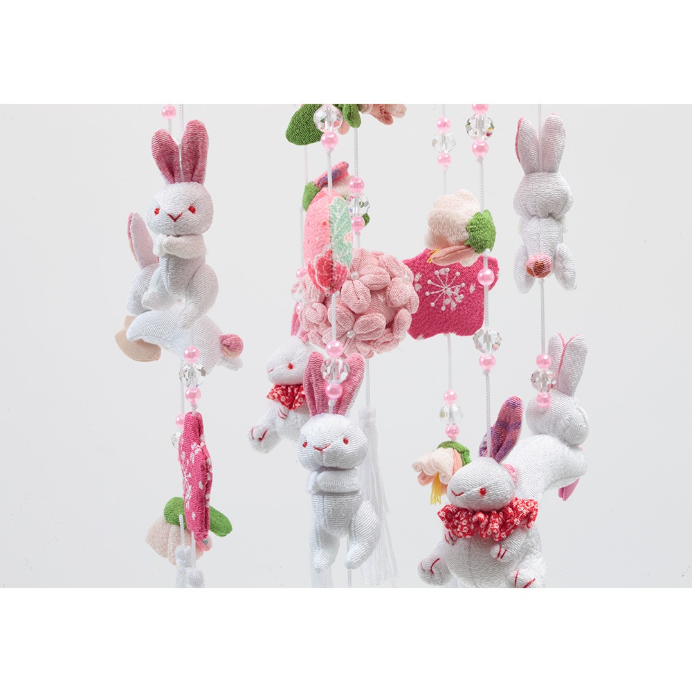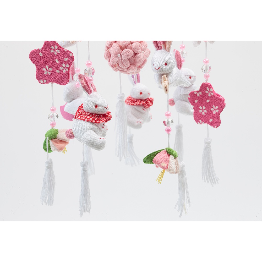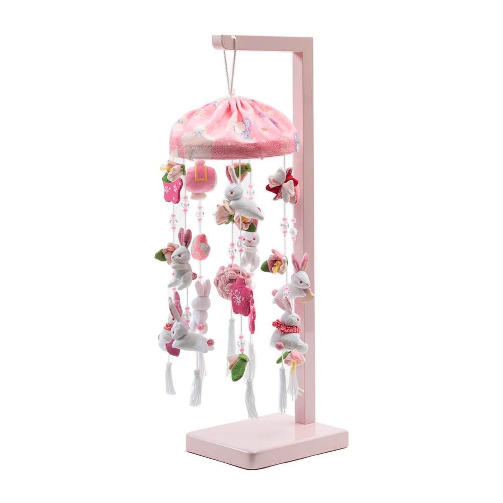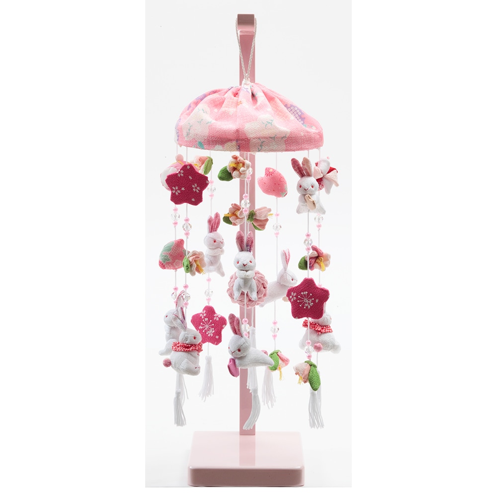 春らしい雰囲気の薄ピンク色のスタンドに、春の象徴や無病息災の意味を持つ"うさぎ"を沢山あしらった、明るく華やかな可愛らしいつるし雛です。