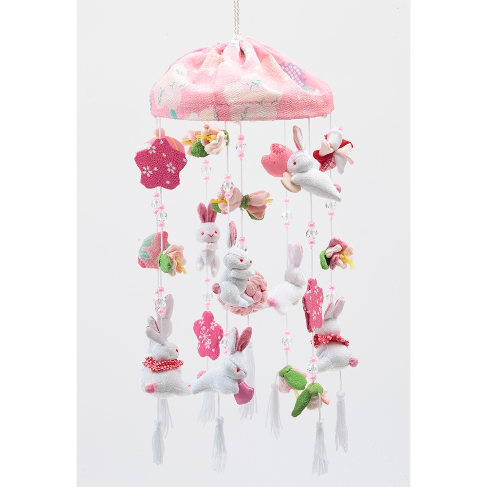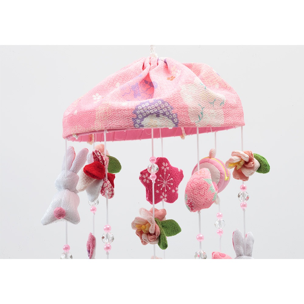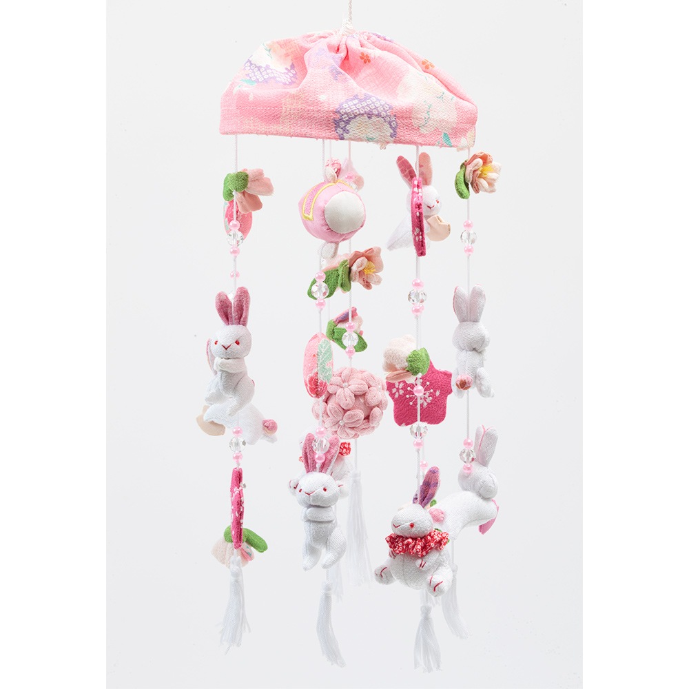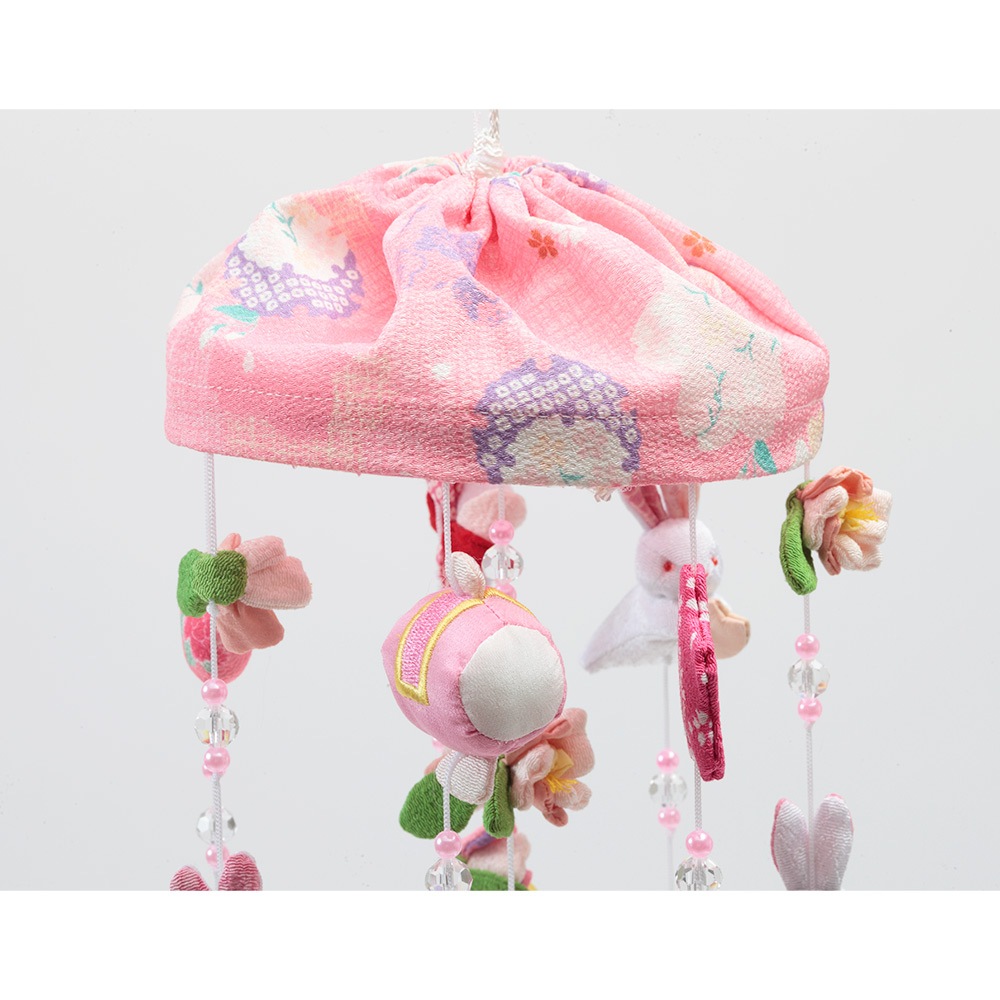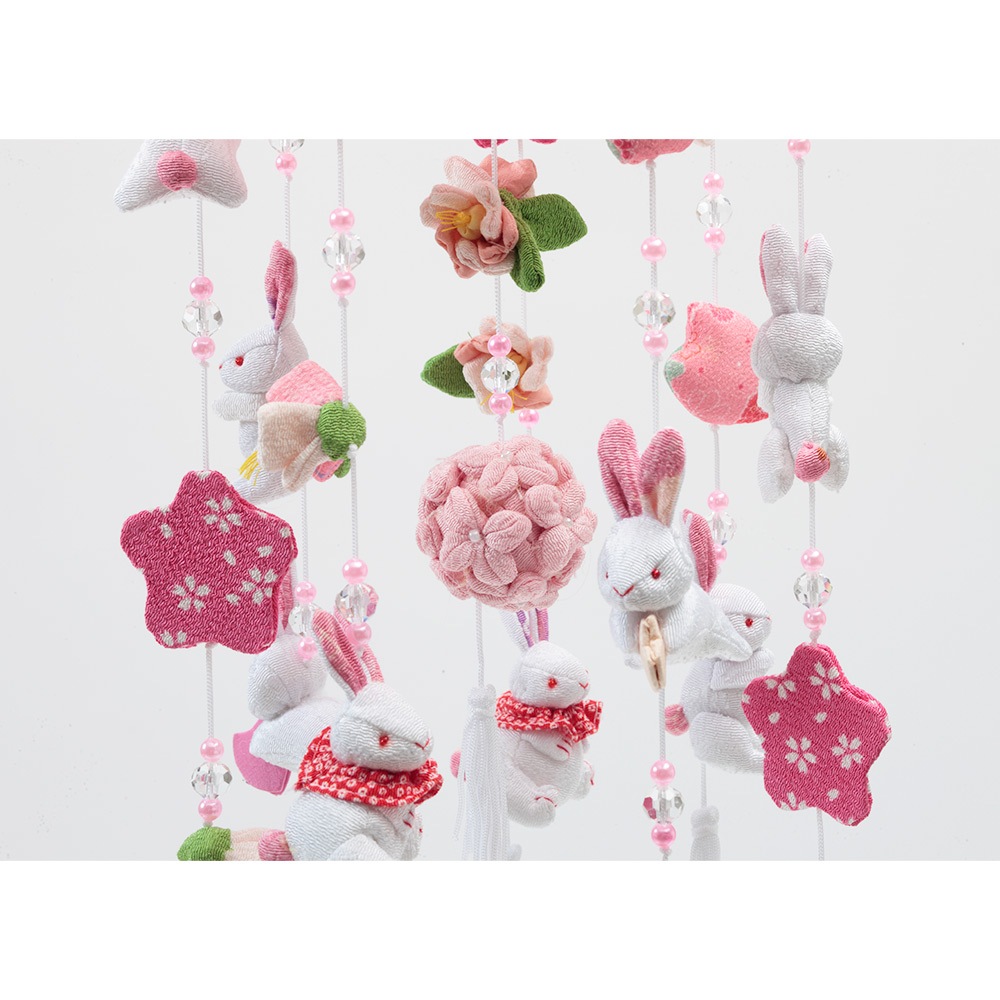 春らしい雰囲気の薄ピンク色のスタンドに、春の象徴や無病息災の意味を持つ"うさぎ"を沢山あしらった、明るく華やかな可愛らしいつるし雛です。
