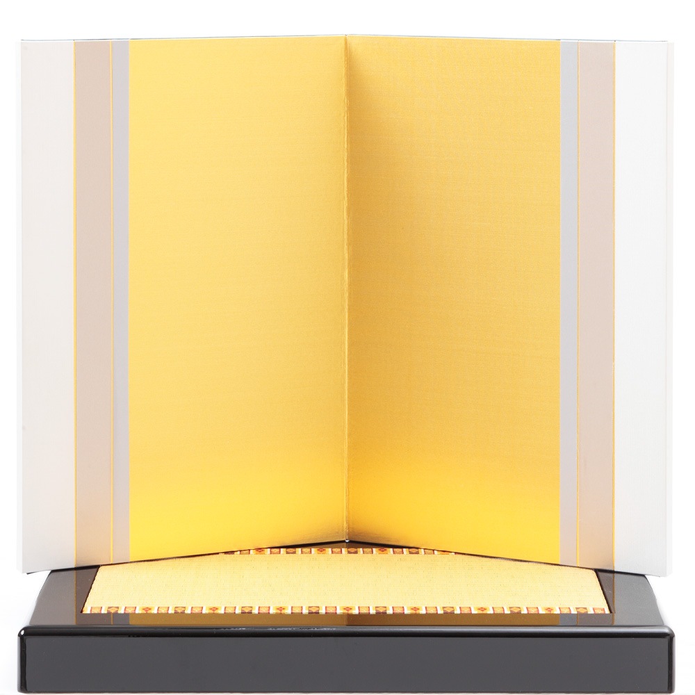 赤黒のシックな色合いの鎧が引き立つように、屏風はあえて金で華やかな雰囲気にしました。
