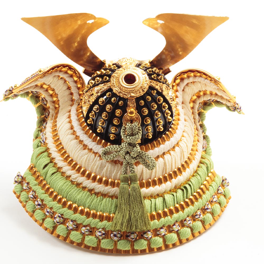爽やかな色彩に魅せられる美しい兜は、一枚一枚の矧ぎ板を継ぎ合わせて完成させる、矧ぎ合わせ鉢と呼ばれる本格的な兜鉢なのも特長です。