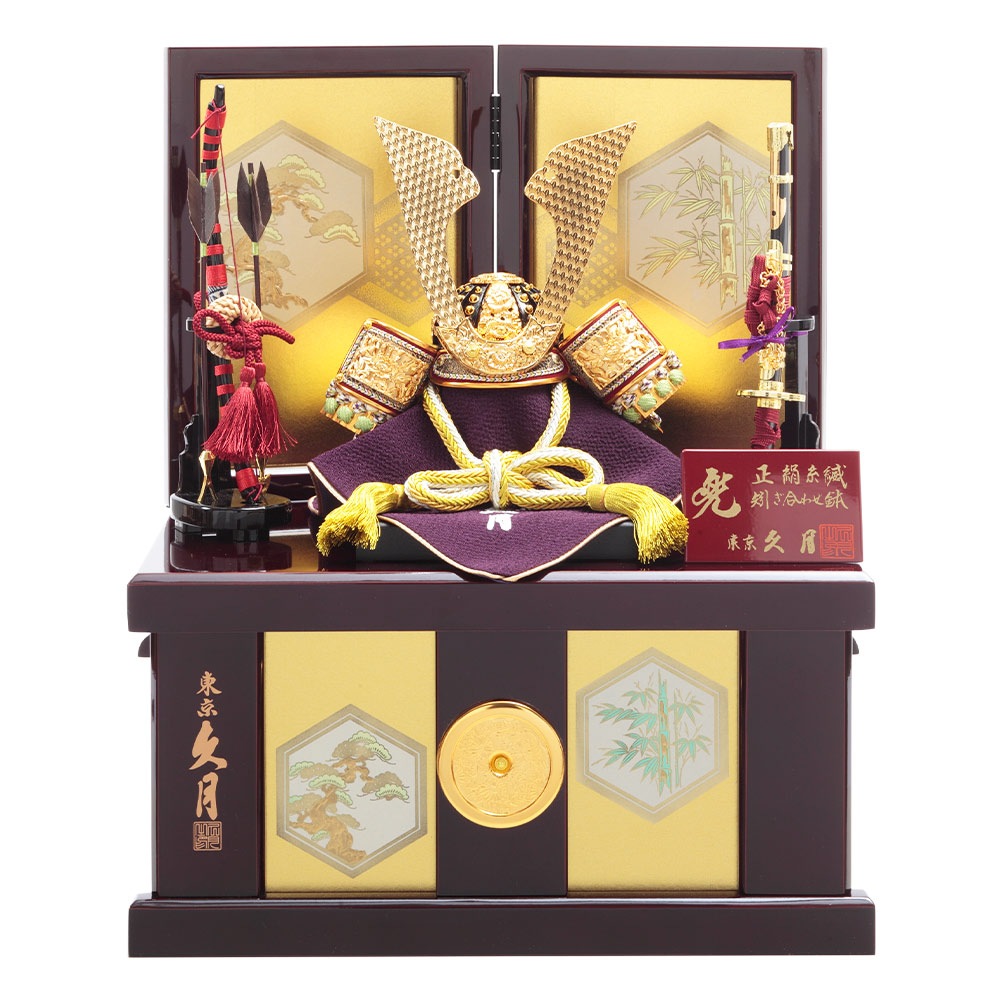 趣のある松と竹の絵柄をあしらった飾り台と屏風に、正絹の縅糸(おどしいと)で仕上げた煌びやかな兜が見事に調和します。