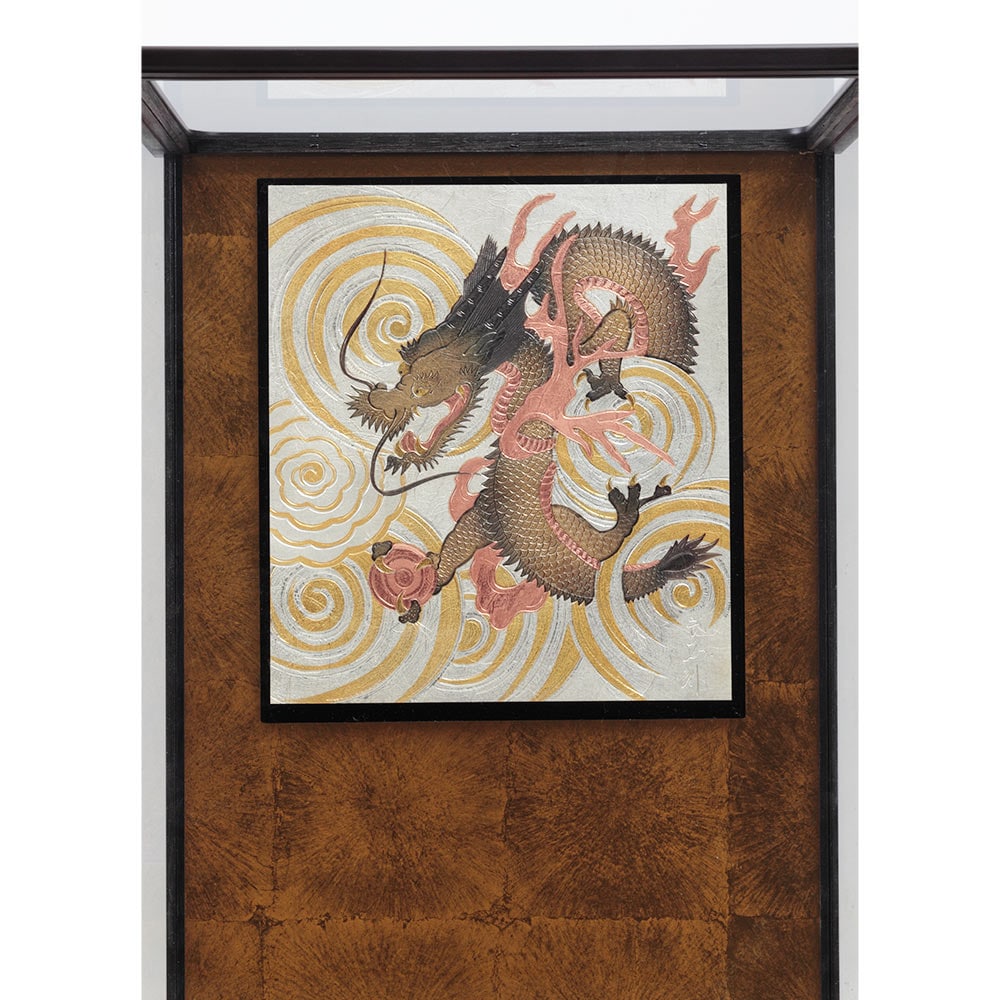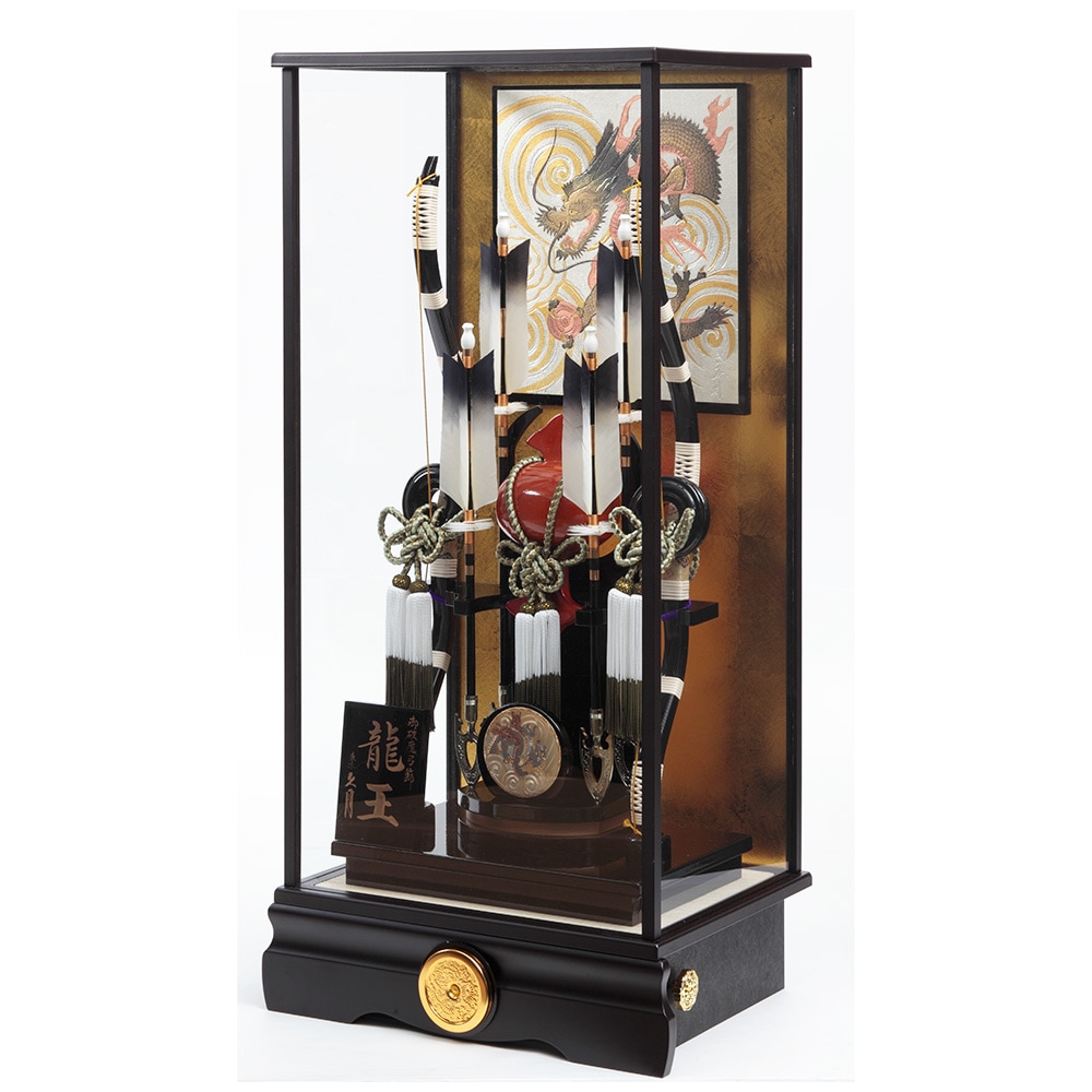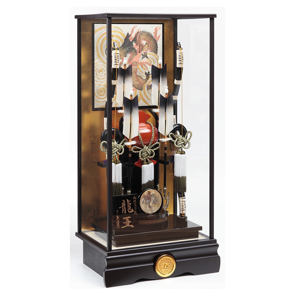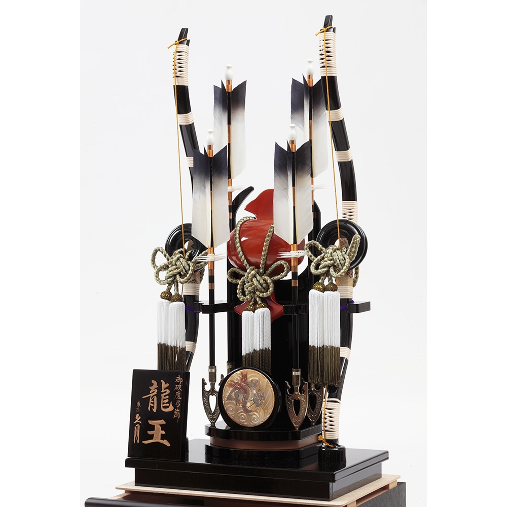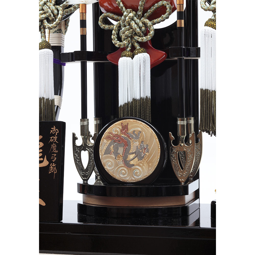 背景に配した勇ましい龍の彫金がお子様の出世を願う、力強い雰囲気の破魔弓飾り。