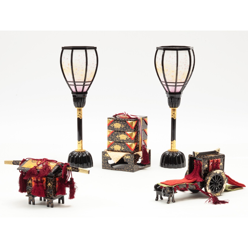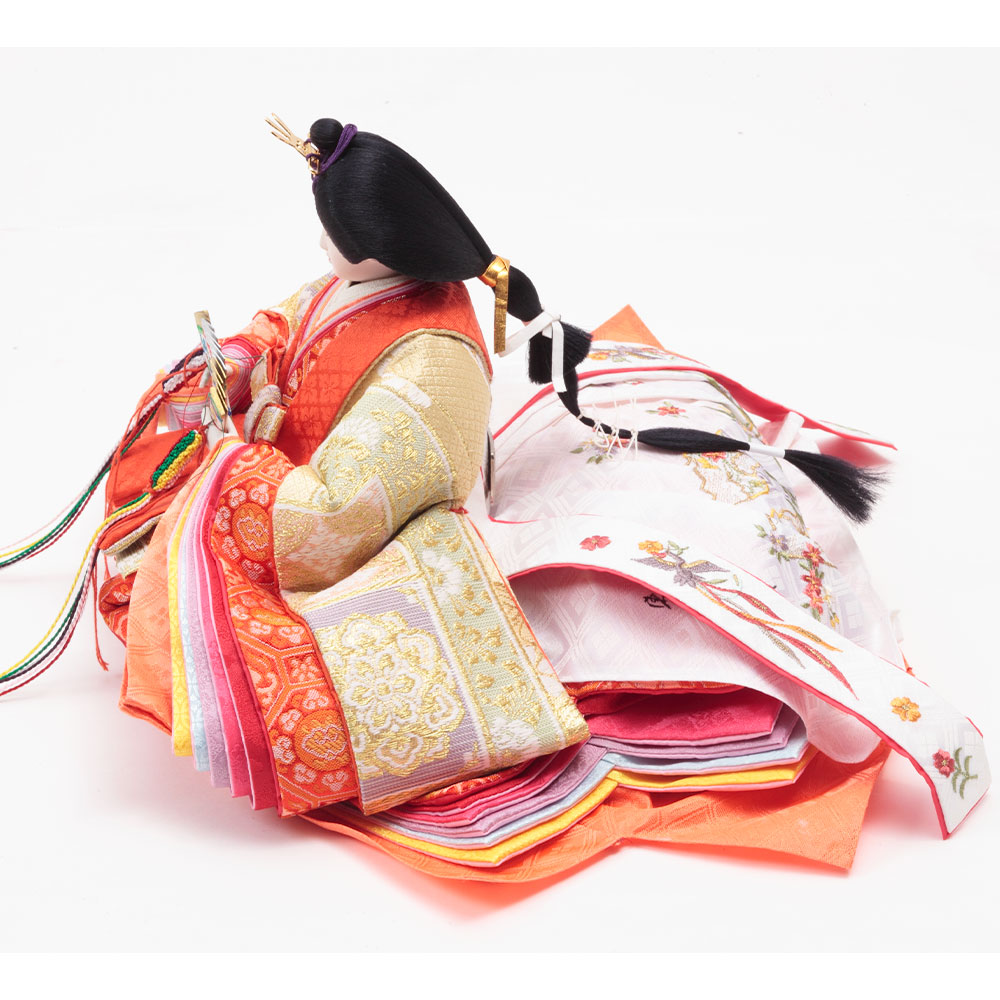 円形の輪が連鎖することから円満や調和を意味する縁起の良い七宝柄をあしらった男雛と、趣のある優美なお顔立ちが魅力の女雛が、高級感のある飾り台と見事に調和します。