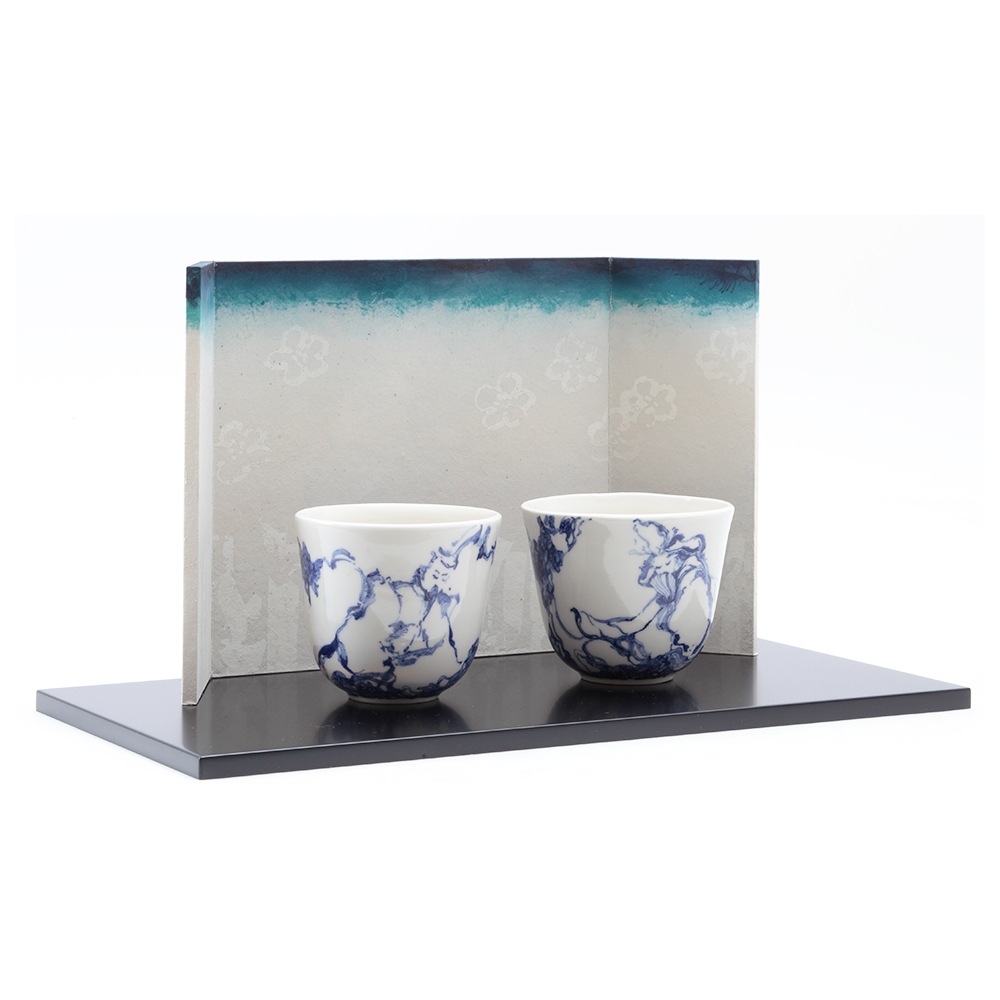 おひなさまに見立てた湯呑みに染付けで男雛と女雛を描いた作品で、大切な人と一緒にお茶を飲む「ヒトトキ」への願いが込められています。