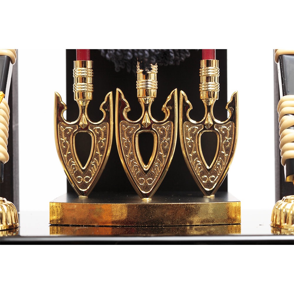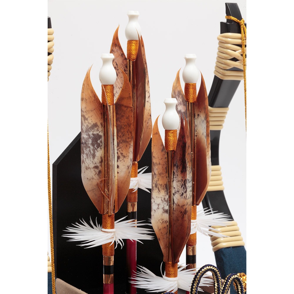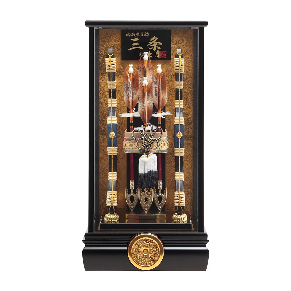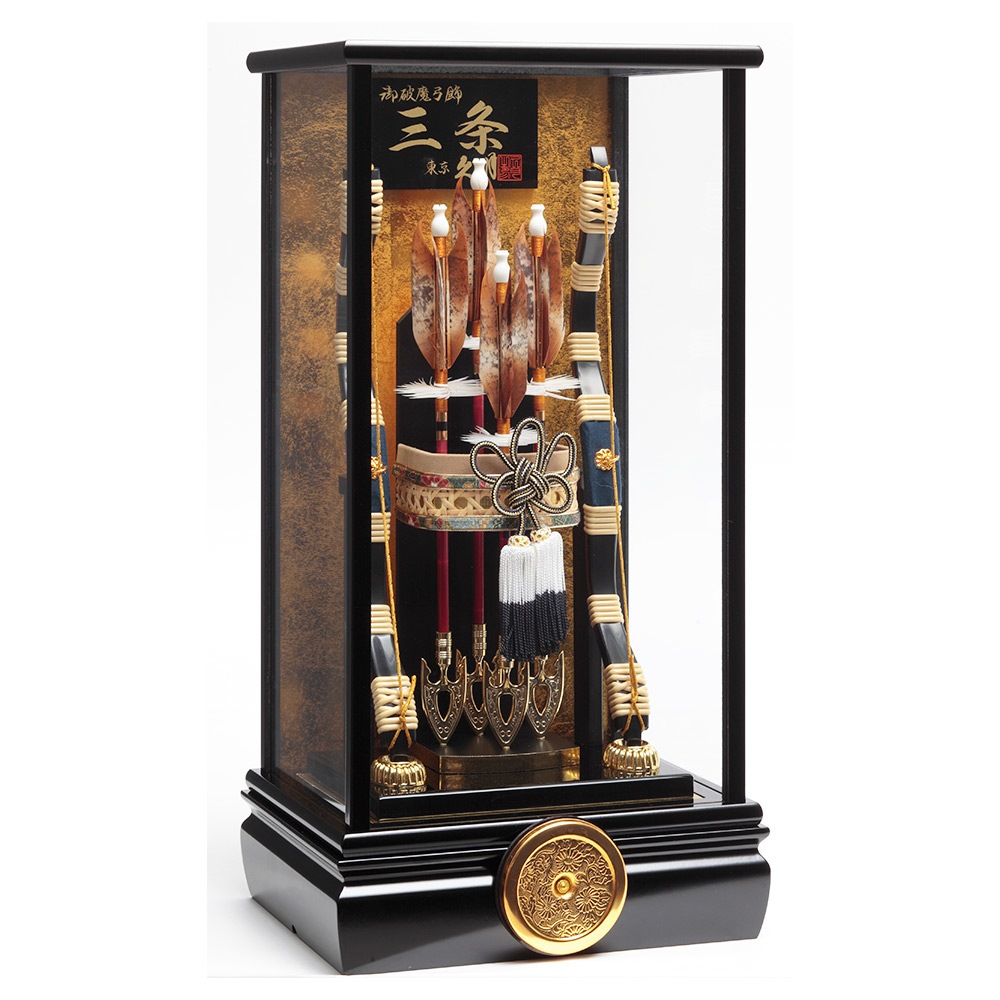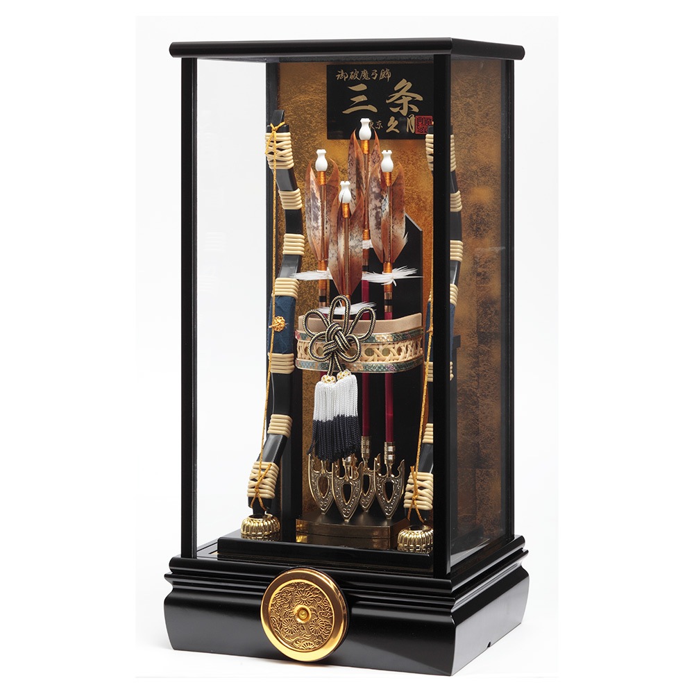 二本弓に四本矢というクラシカルな仕立ての中造りが、高級感のある黒塗りのケースに良く映えるお飾りです。