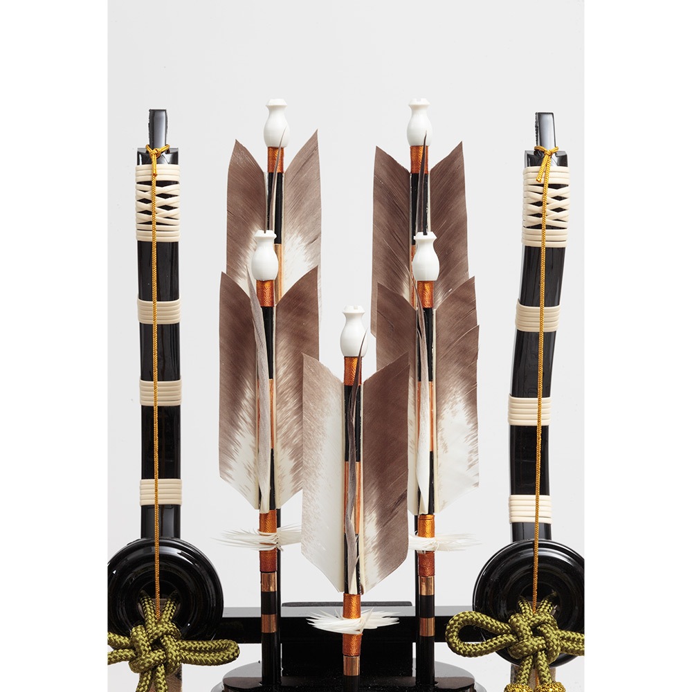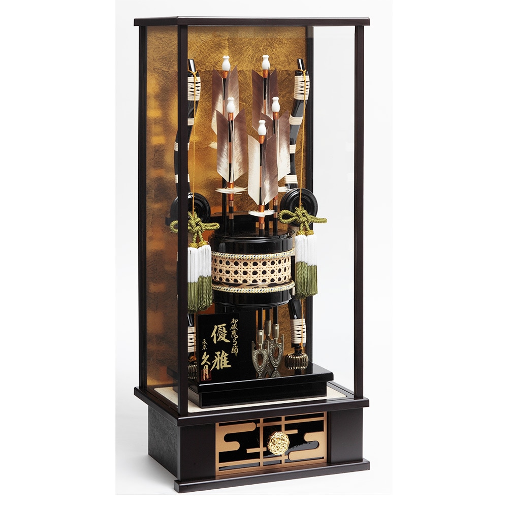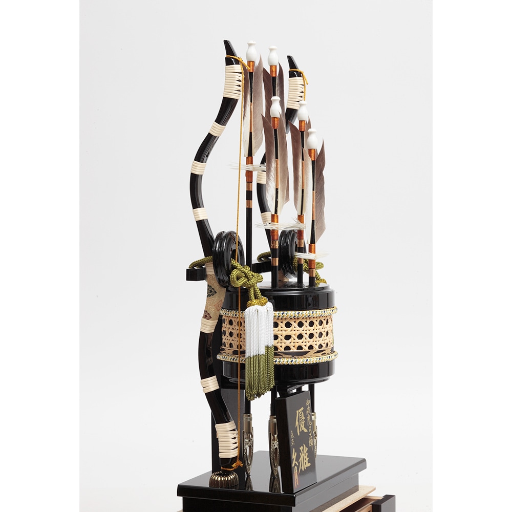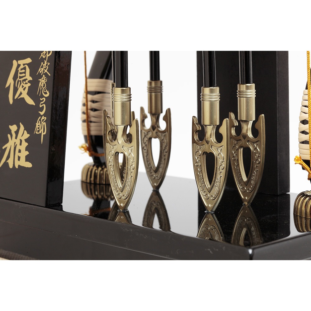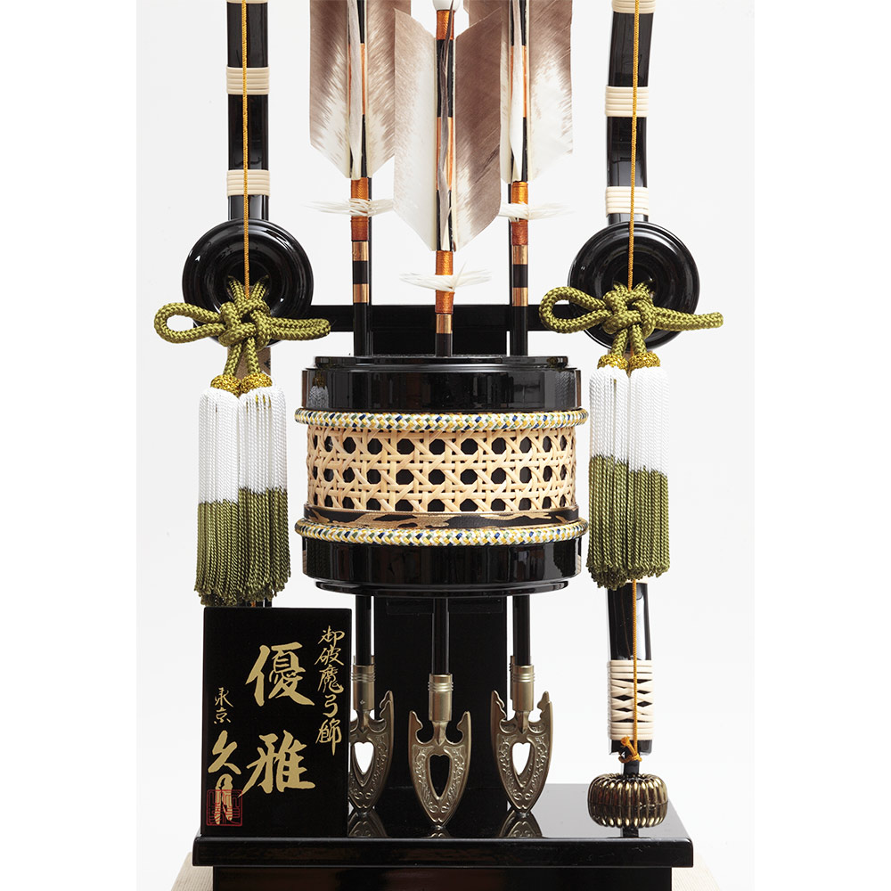 上品な黒塗りのケースに重厚感のある中造りが見事に映える破魔弓飾り。