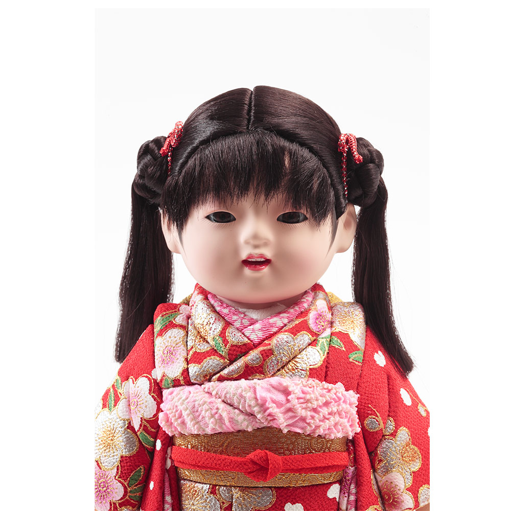 あどけなさのある可愛らしい幼顔のお人形で、魔除けの意味を持つ赤を基調とした衣裳が華やかさを感じさせます。