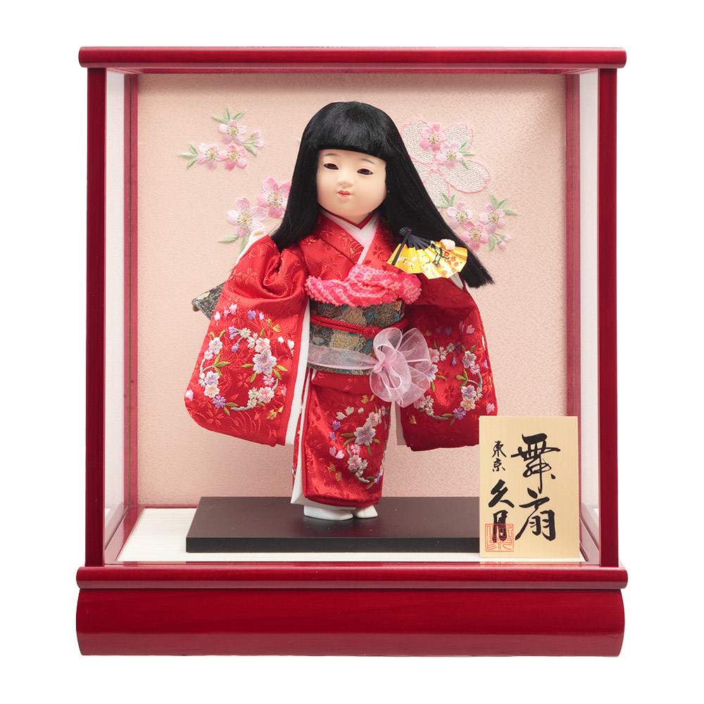 鮮やかな赤色のケースに、色合いを合わせた華やかな衣裳のお人形が見事に映える浮世人形です。