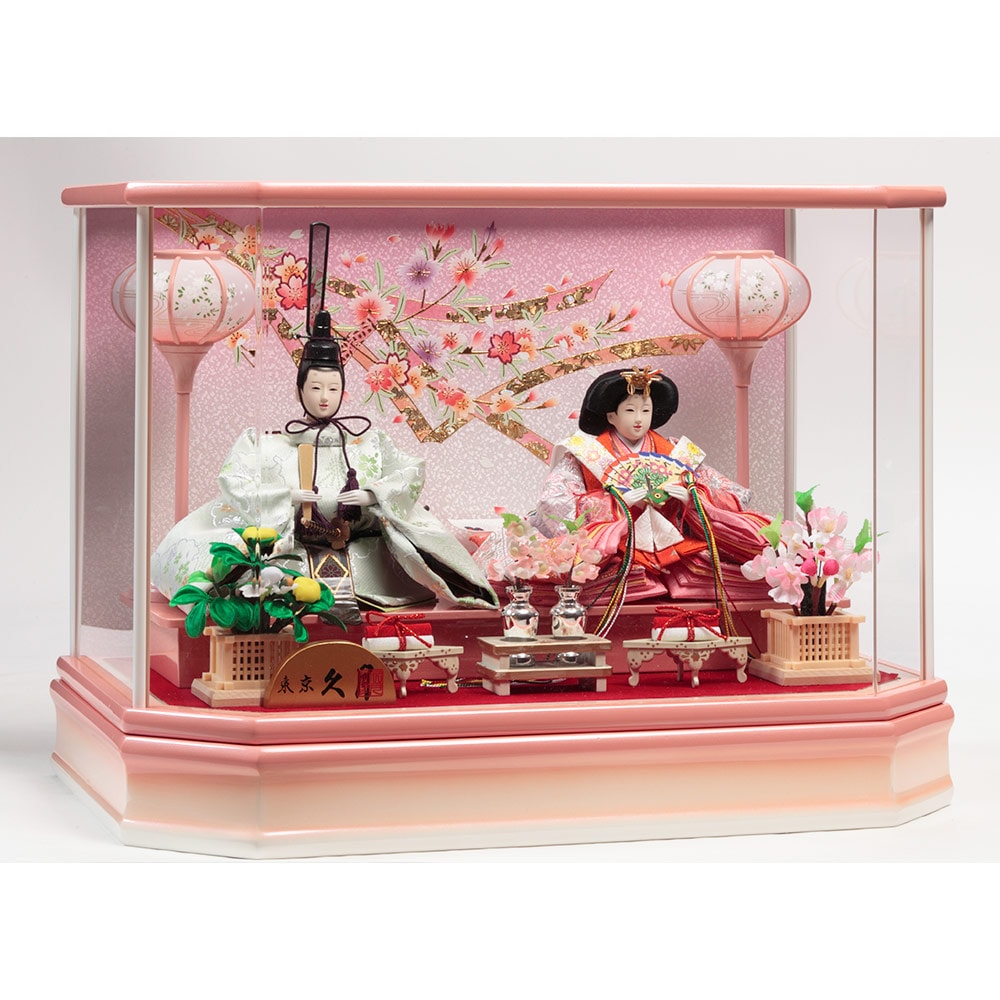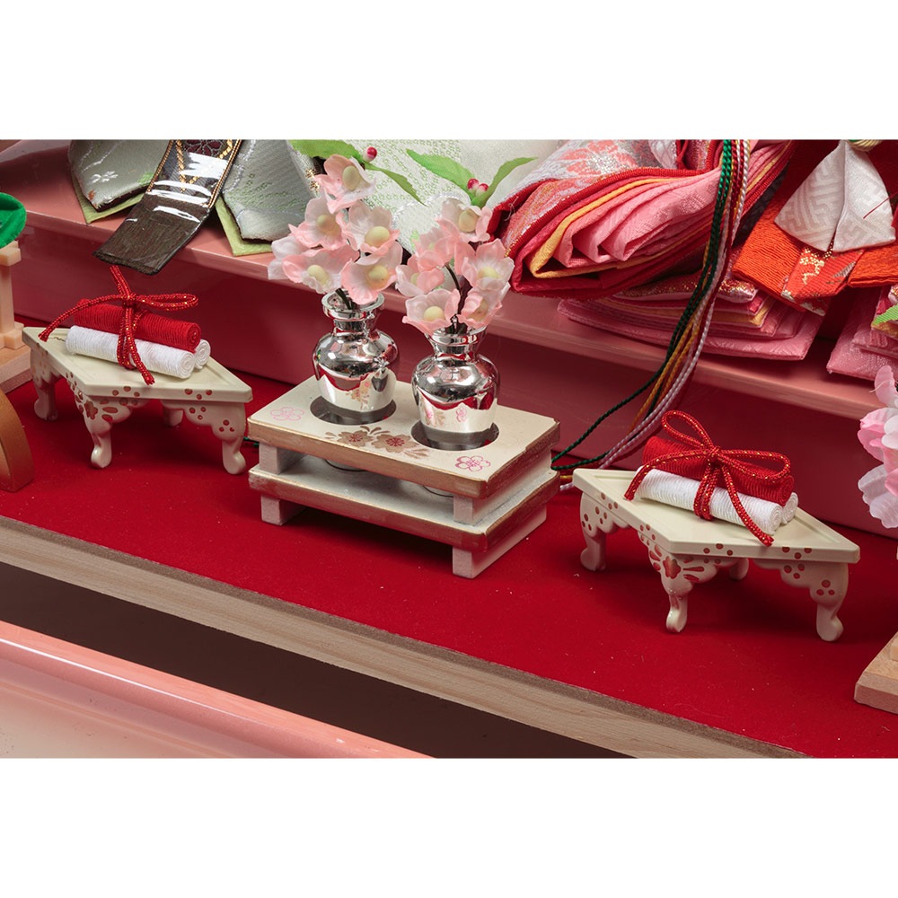 雪洞やお道具も薄ピンクの色合いで合わせた、春の日のお祝いに相応しいケース入りの親王飾りです。