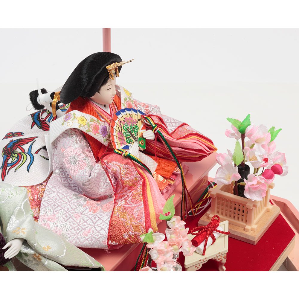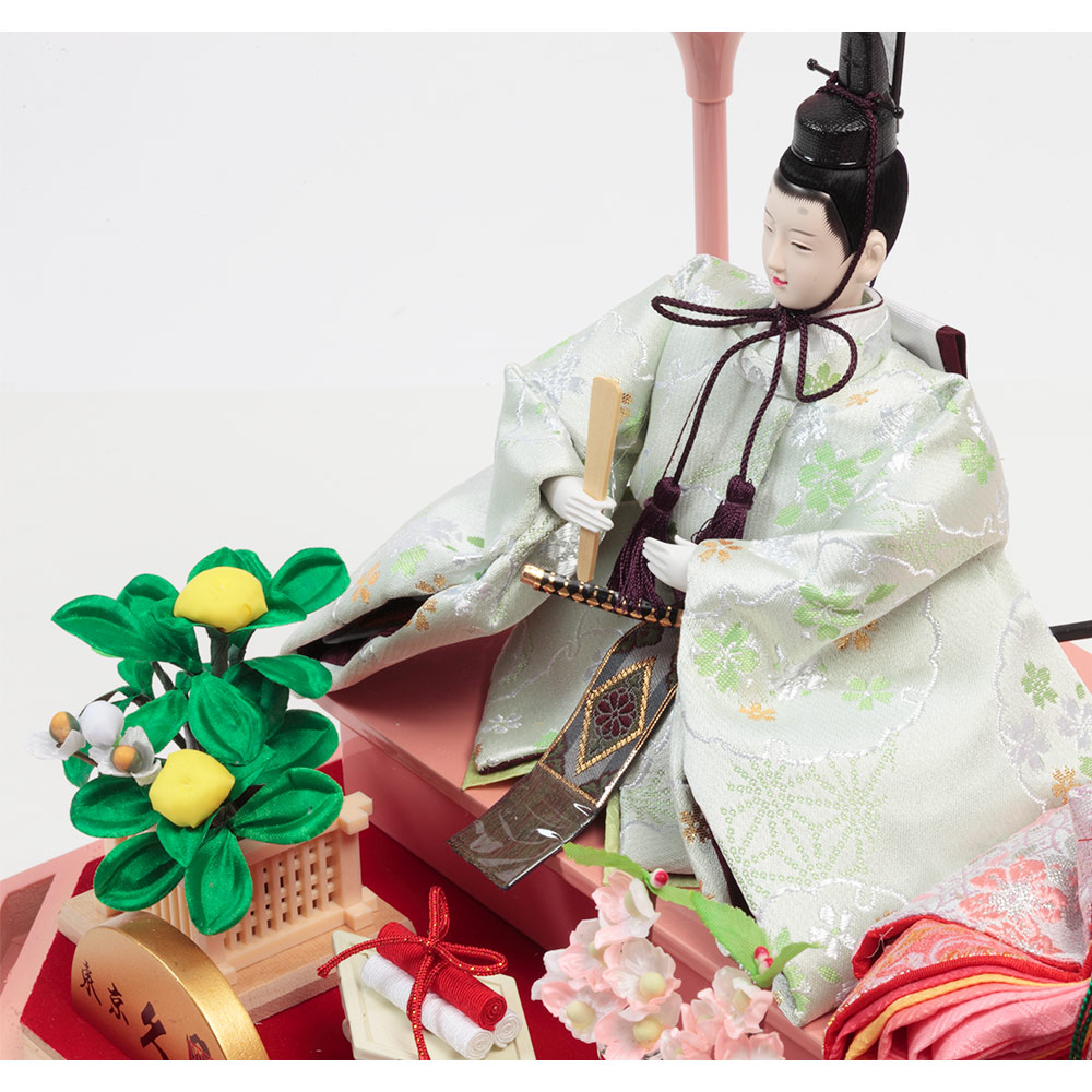 薄ピンクの優しい色合いで全体をコーディネートした、春らしい雰囲気のおひなさま。