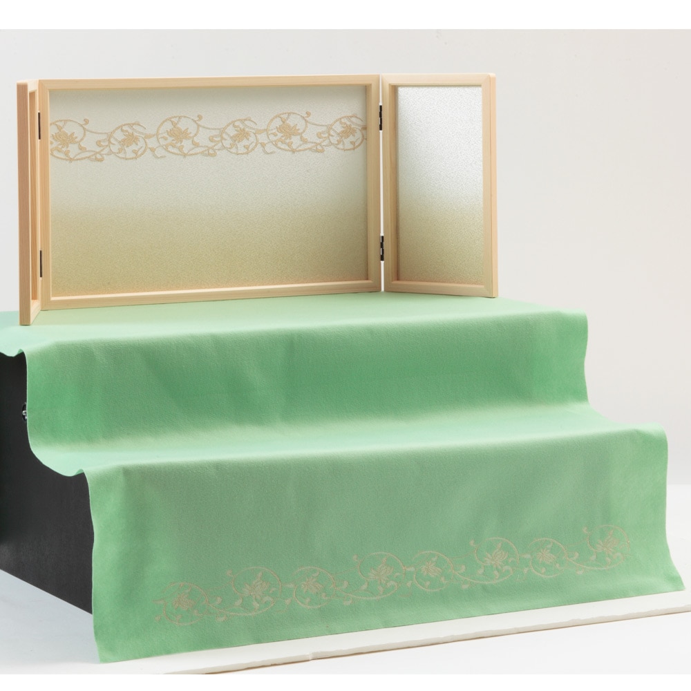 鮮やかなミントグリーンの毛氈に、淡い色合いの可愛らしいお人形が見事に調和します。