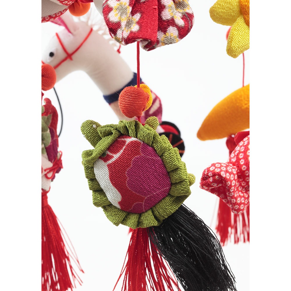 神の使いとされる白馬や、春の象徴とされる"うさぎ"など、幸福や無病息災などを願う沢山のおめでたい飾りを下げて華やかに仕立てました。