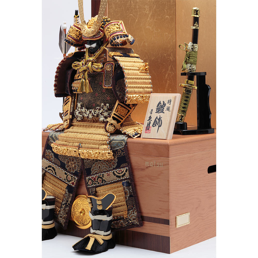 飾り台にあしらった武士の象徴である二引の柄も高級感のある鎧を引き立てる、飽きの来ない上品な趣に魅せられる人気のお飾りです。