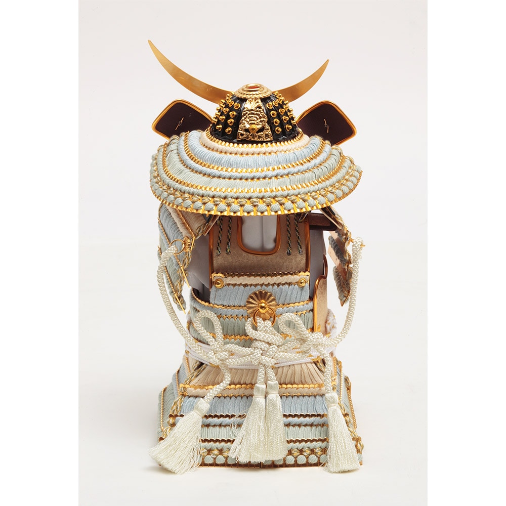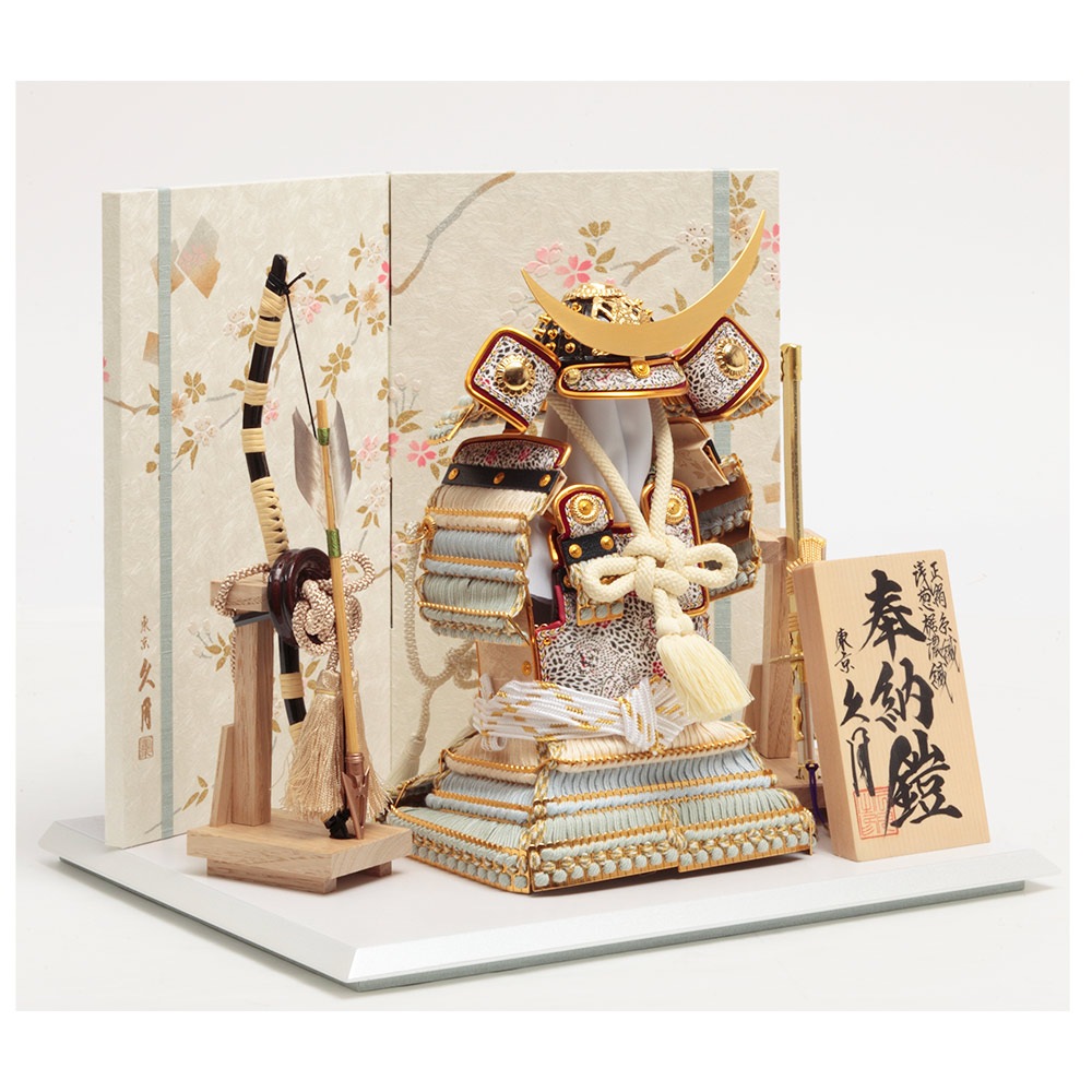 明るい白を基調とした縅糸(おどしいと)と屏風の色が揃いお節句にふさわしい明るいセットになっております。
