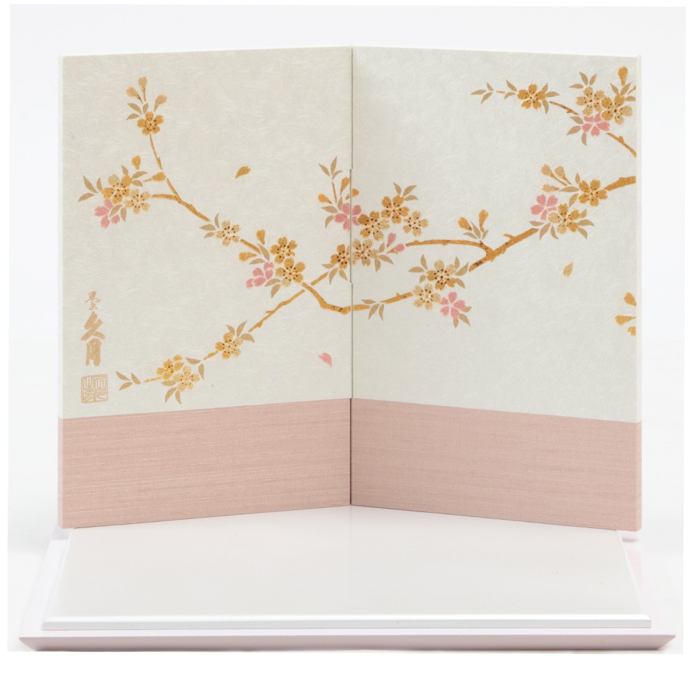 桜を描いた明るい雰囲気の屏風に、凛々しくも可愛らしい鎧着姿のお人形が見事にマッチします。