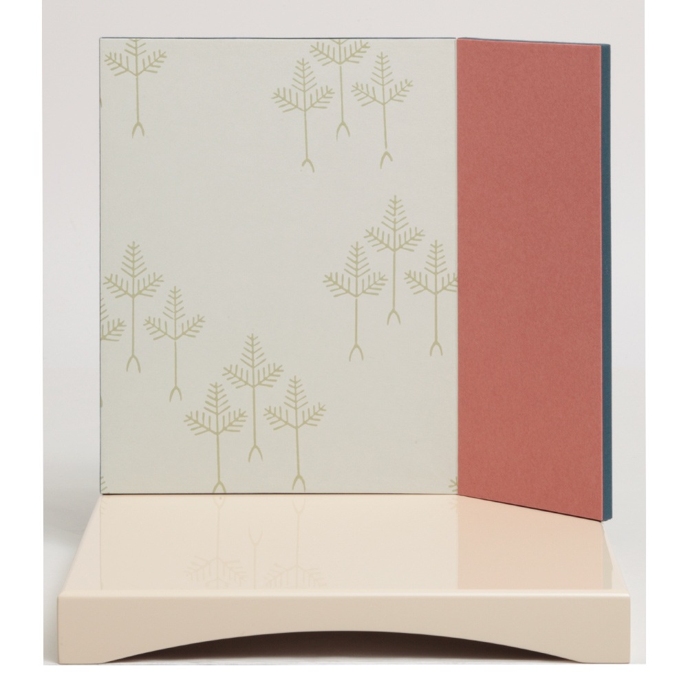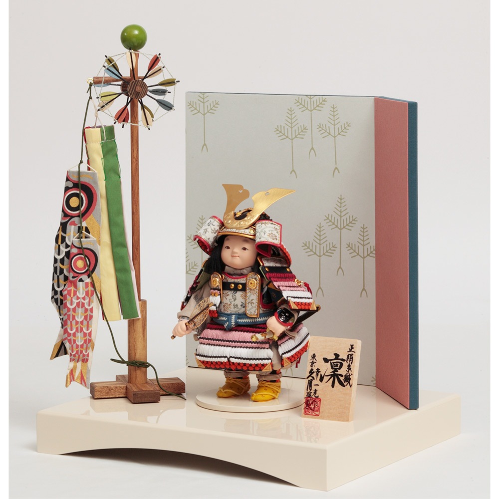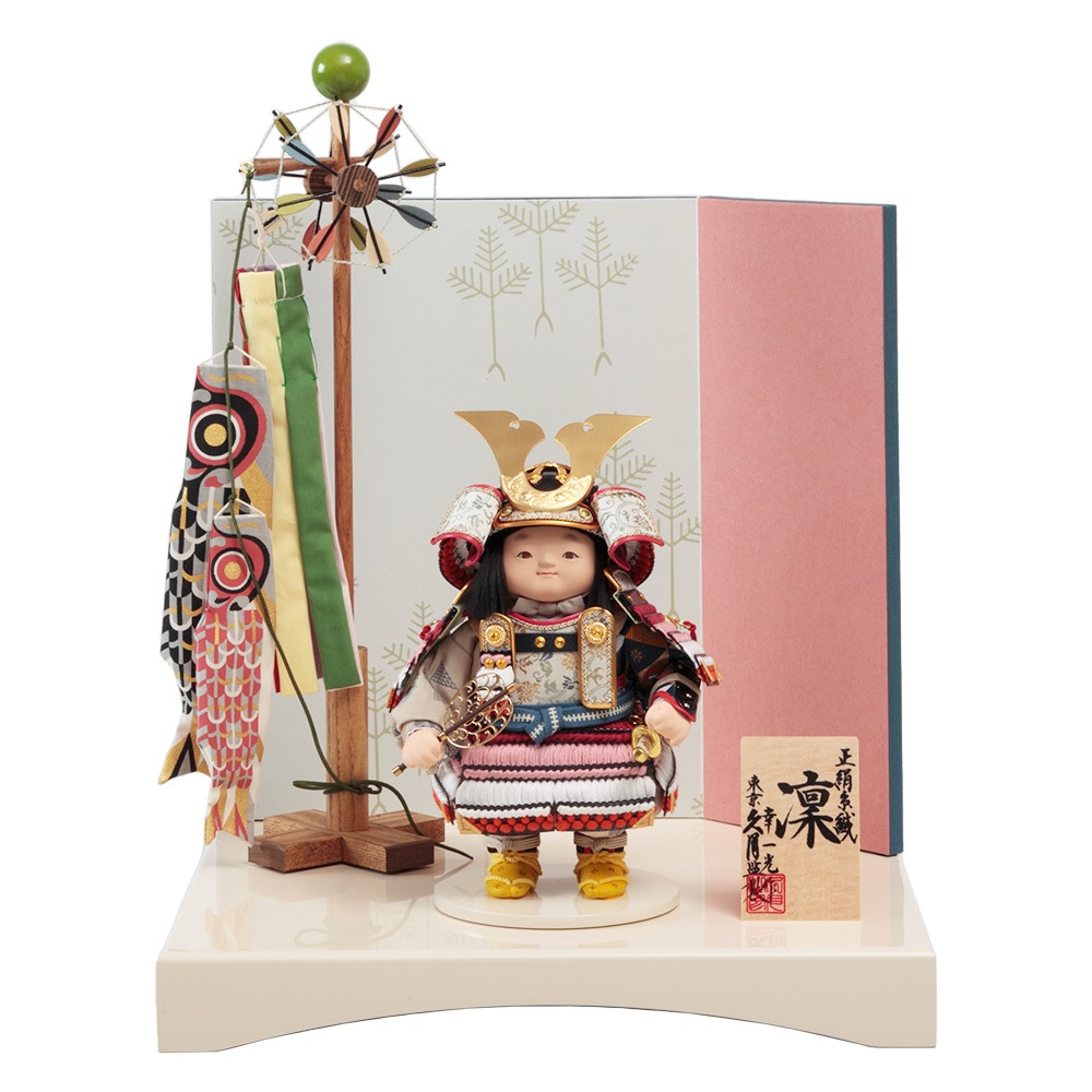 凛とした鎧着姿が勇ましくも可愛らしいお人形を、爽やかさを感じる明るい色合いの屏風に合わせました。