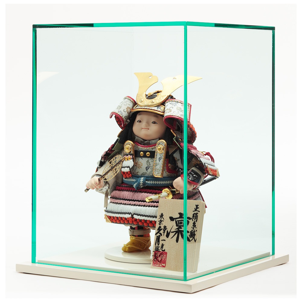 凛とした鎧着姿が勇ましくも可愛らしいお人形を、モダンな仕立てのアクリルケースに合わせました。
