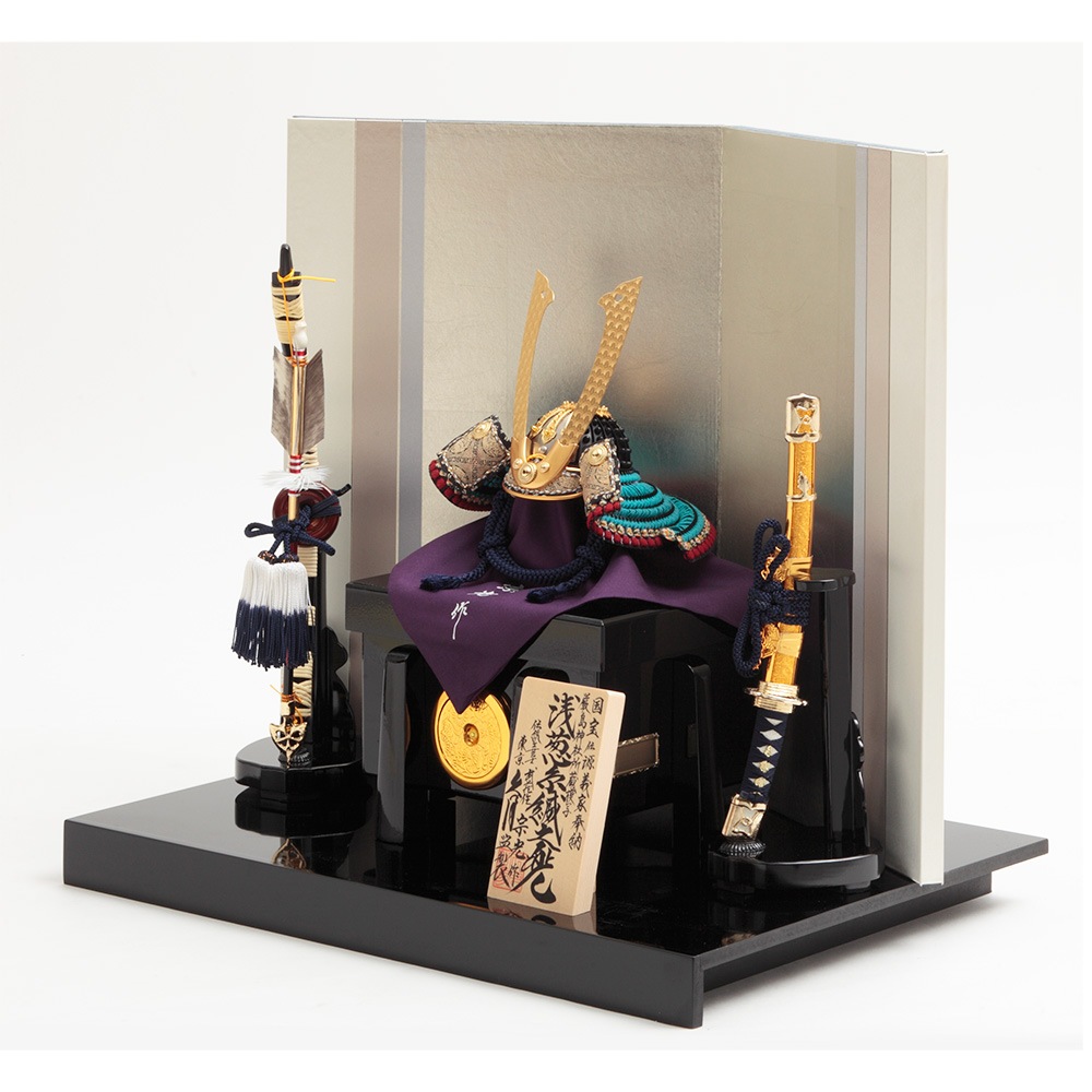 鮮やかな浅葱色の縅糸(おどしいと)を緻密に縅した美しい兜が、シルバーを基調としたスタイリッシュな屏風に見事に映えます。