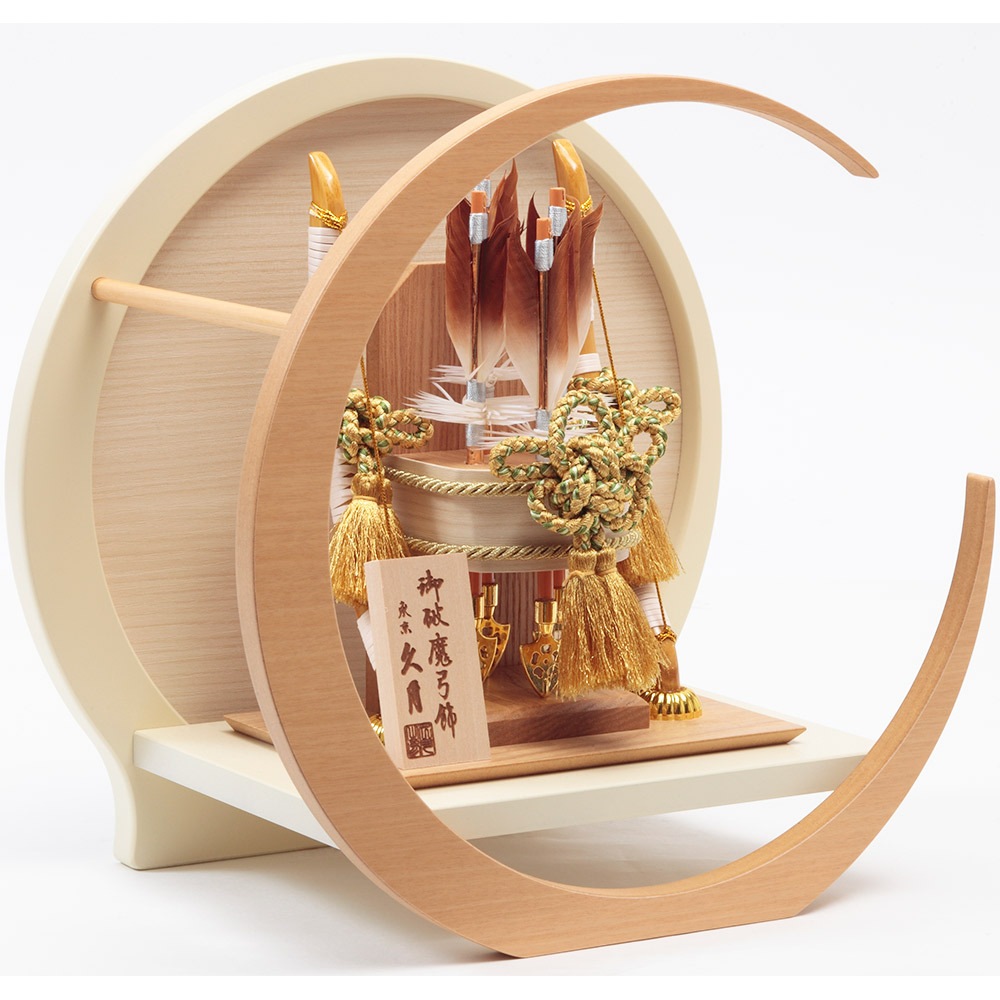 三日月をモチーフにしたモダンな仕立ての飾り台に、暖か味のある色合いが印象的な破魔弓を合わせました。