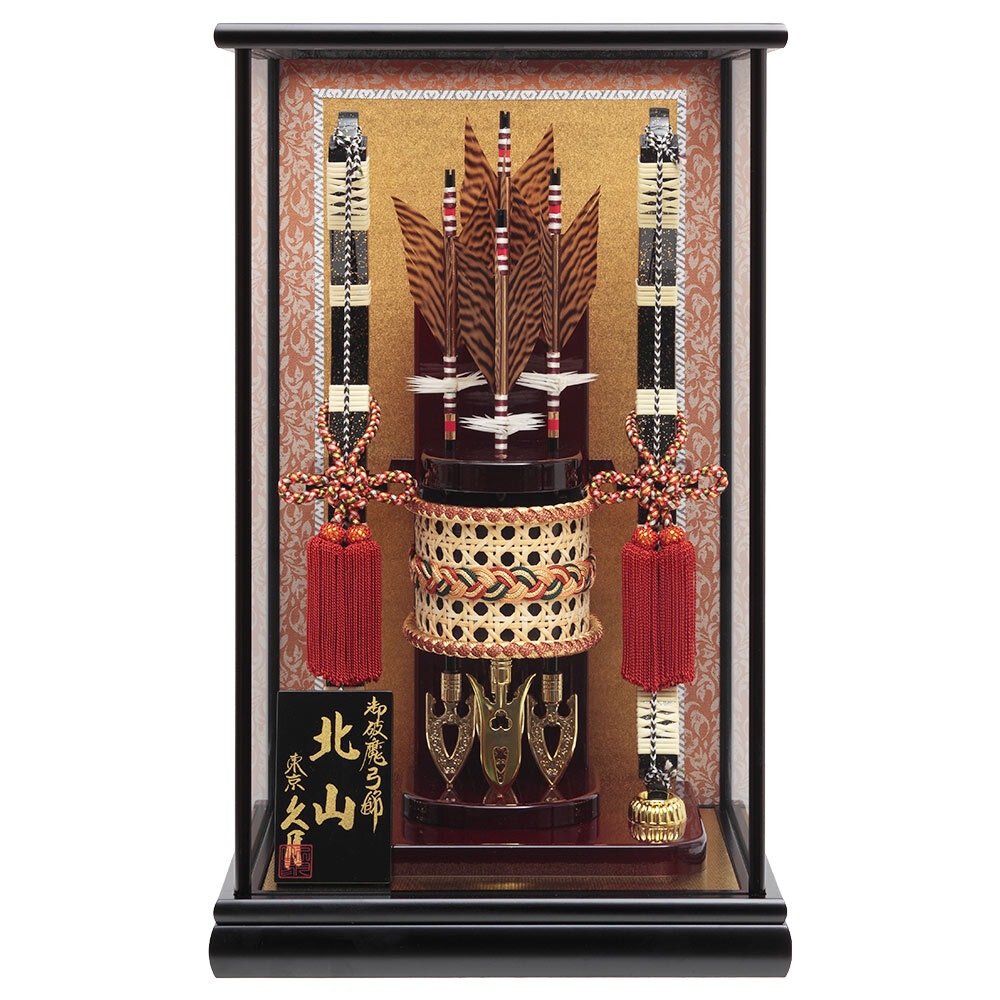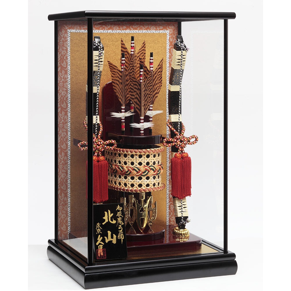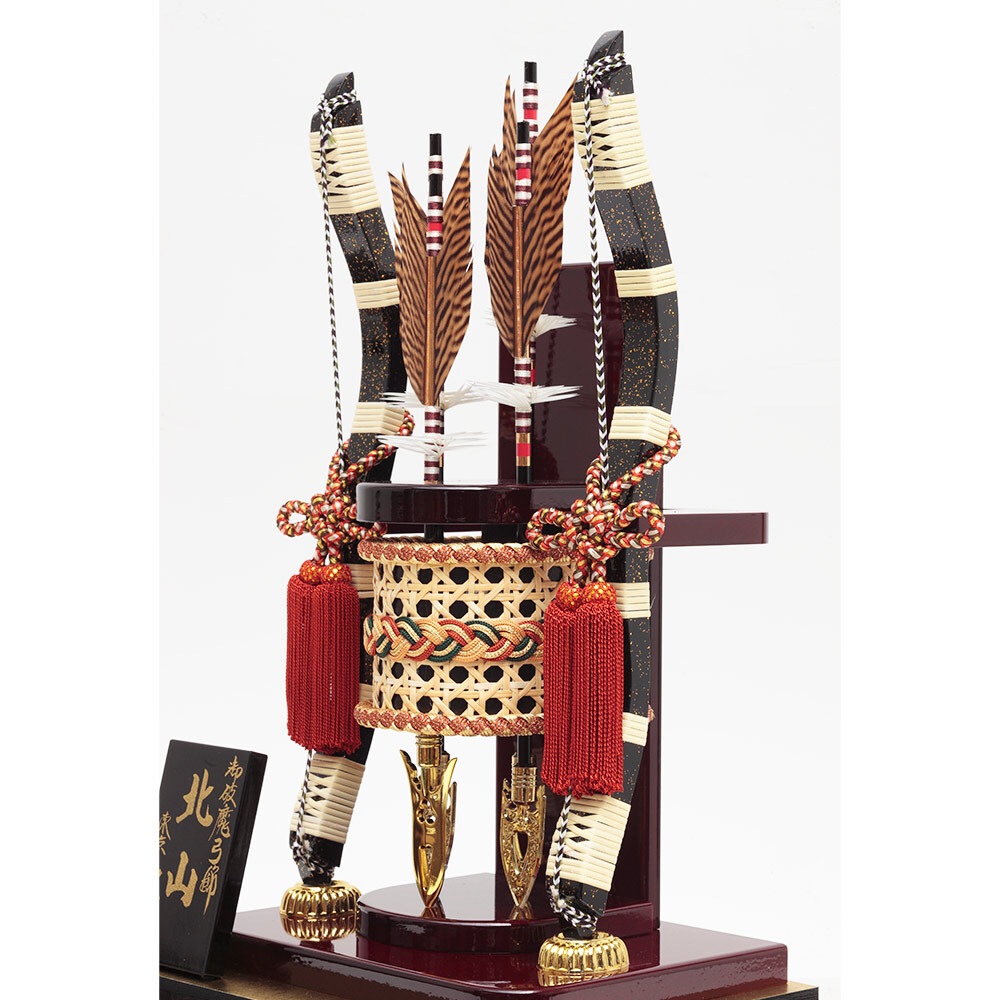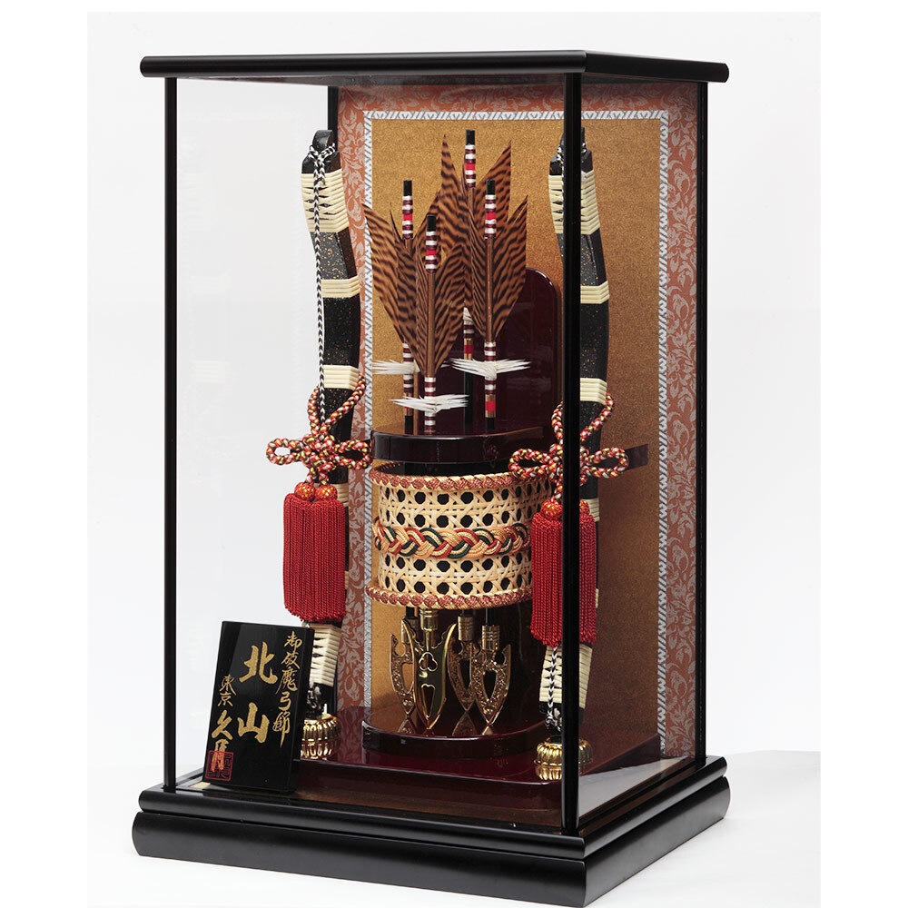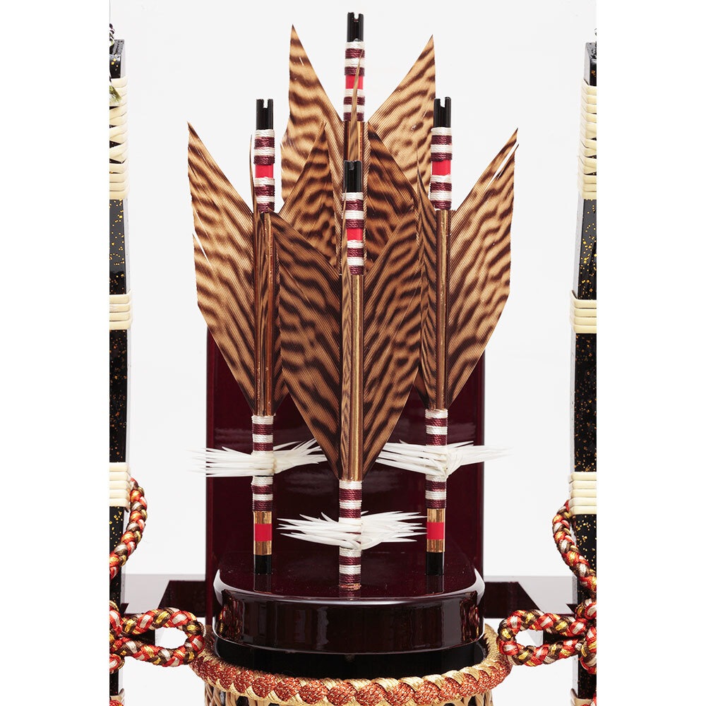 高級感のある黒塗りのケースに、クラシカルなデザインの中造りが見事に映える破魔弓飾りです。