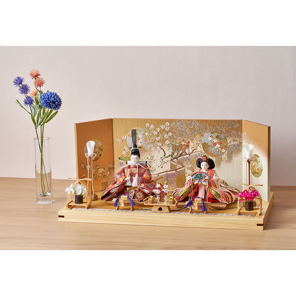 細部まで手作業で仕上げた上品なお人形が、春の日のお祝いに鮮やかな彩を添える、明るく華やかな雰囲気が魅力のおひなさまです。
