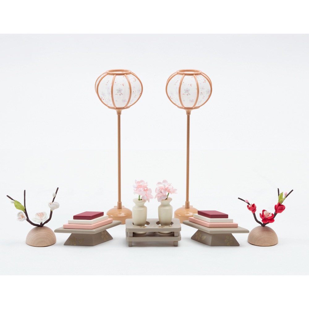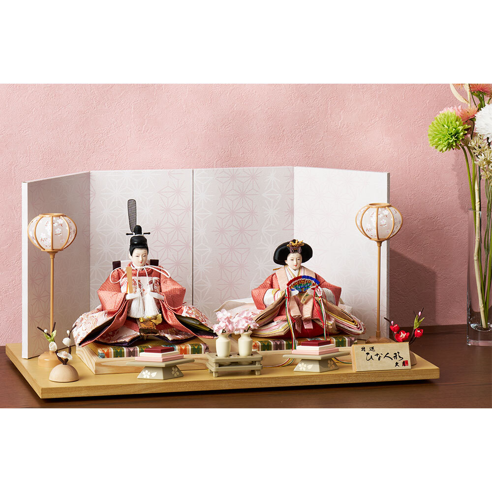 女の子のお祝いに相応しい、明るく優し気な色合いで全体をコーディネートした、洋間にも違和感無くマッチする人気の親王飾りです。
