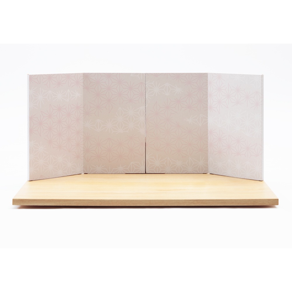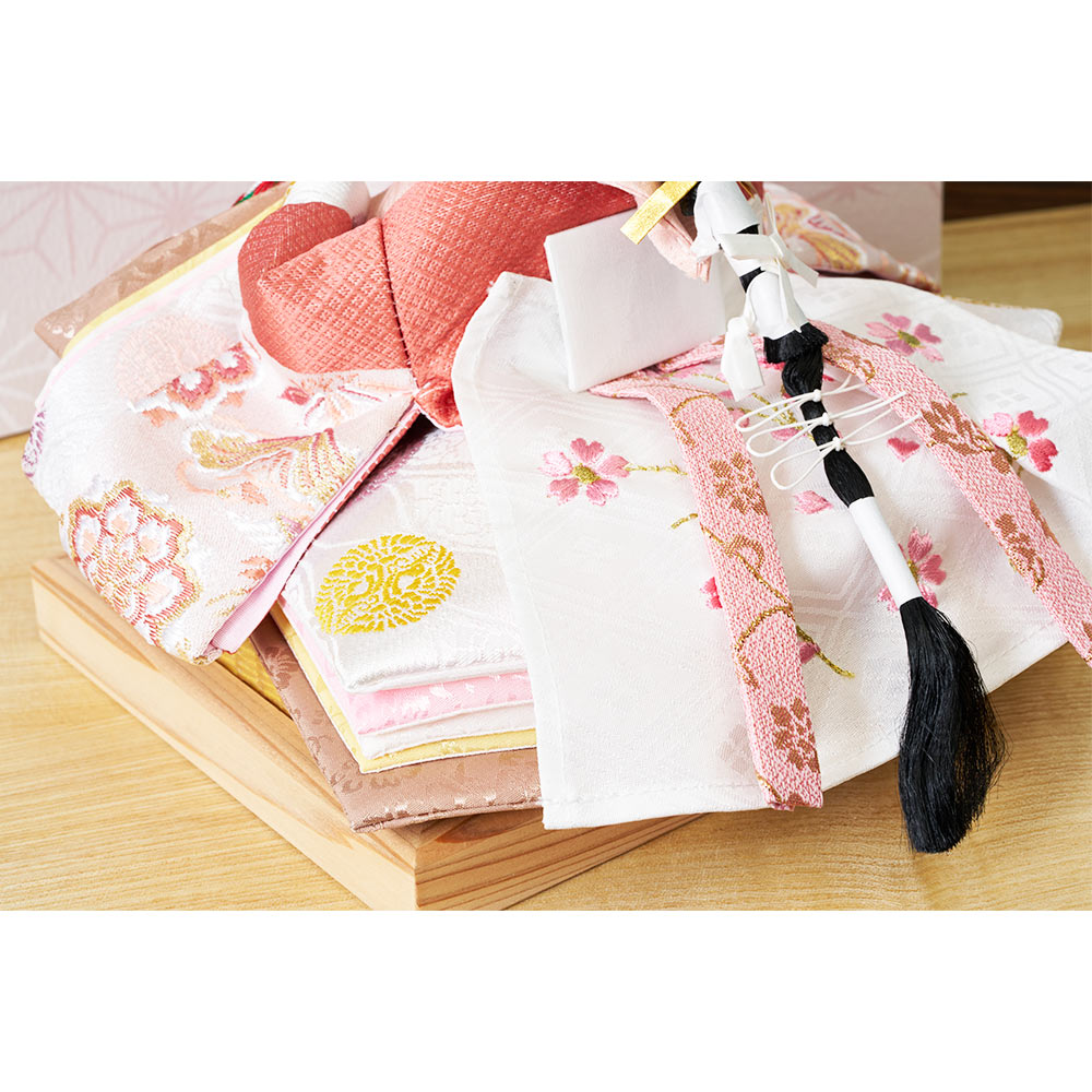 美しい木肌が素敵なナチュラルテイストの飾り台に、桃色の段織衣裳をまとった可愛げに佇むお人形が見事に映えます。
