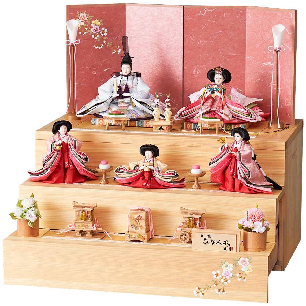 衣裳に可愛らしい花柄の刺繍を施した、明るく春らしい色彩の男雛と女雛が、檜の暖か味のある風合いと美しく調和する、和室はもちろん洋間にも違和感無くマッチする人気のおひなさまです。