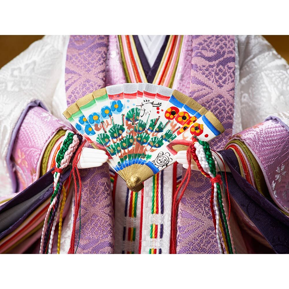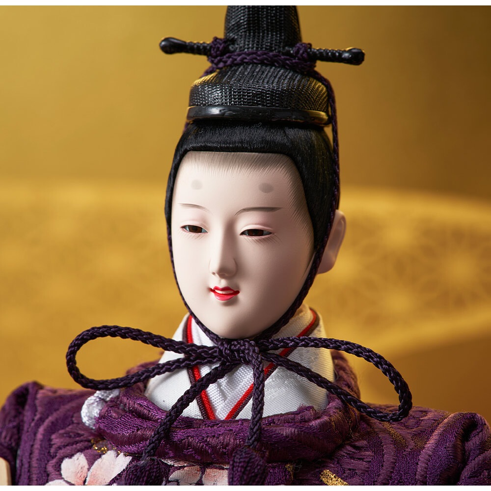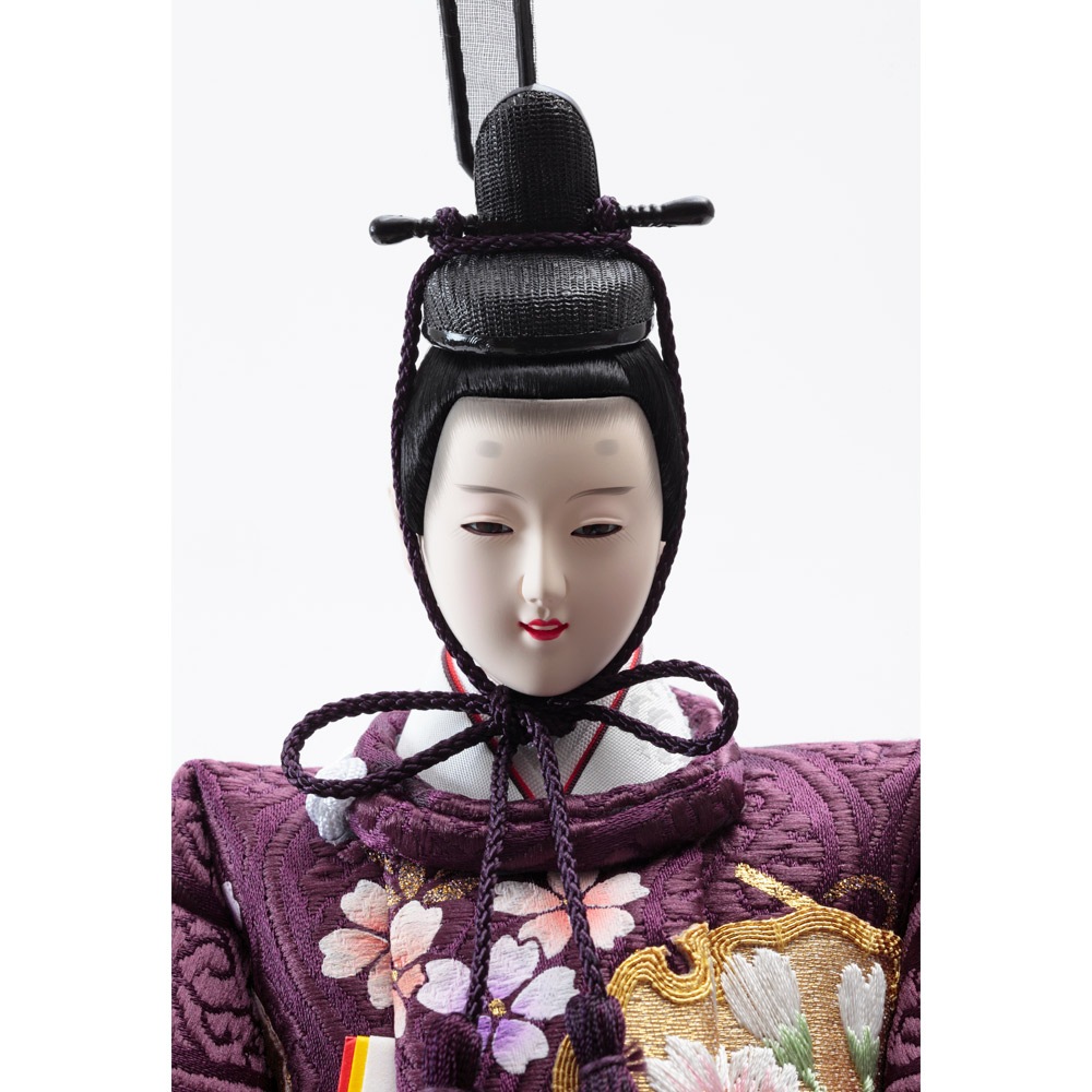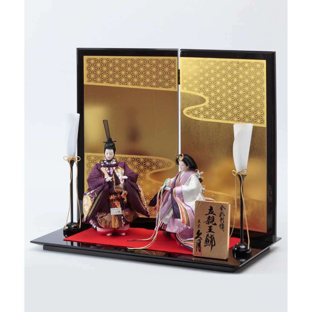 趣のある麻の葉文様を描いた高級感のある屏風に、紫と白のコントラストが素敵な男雛と女雛が上品に映えます。