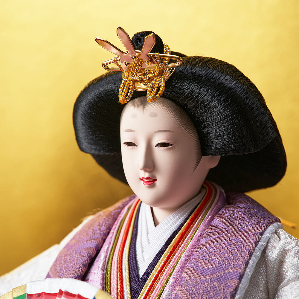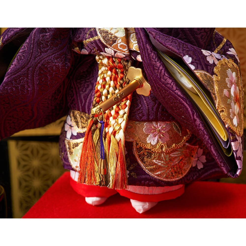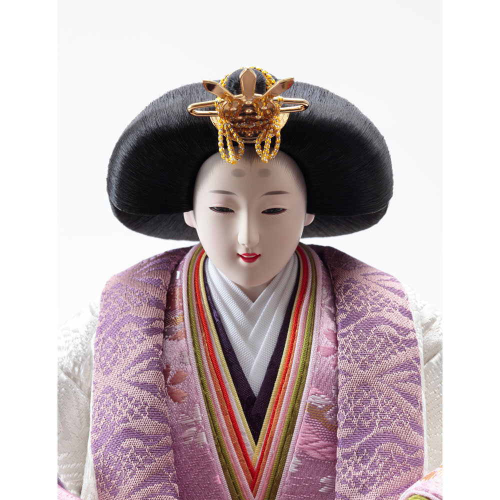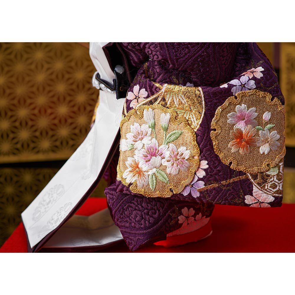 趣のある麻の葉文様を描いた高級感のある屏風に、紫と白のコントラストが素敵な男雛と女雛が上品に映えます。