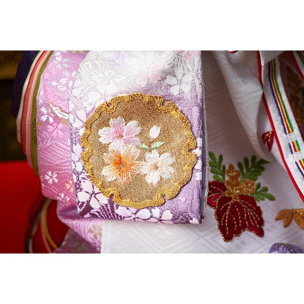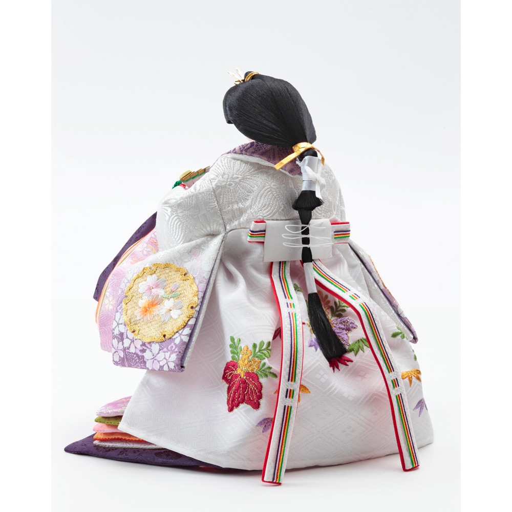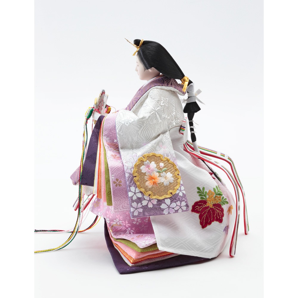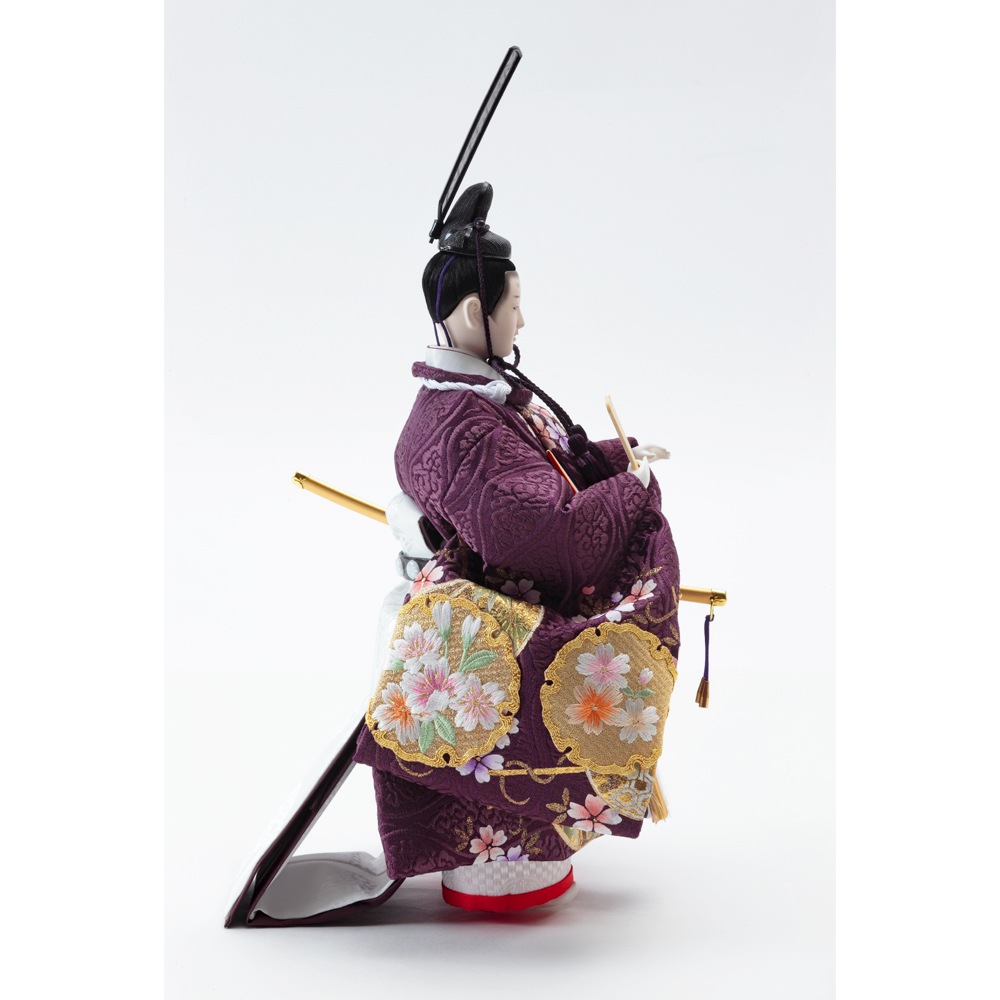 豪華な花柄の刺繍を衣裳にあしらった、お人形の美しさを堪能出来る立ち姿の親王飾りです。