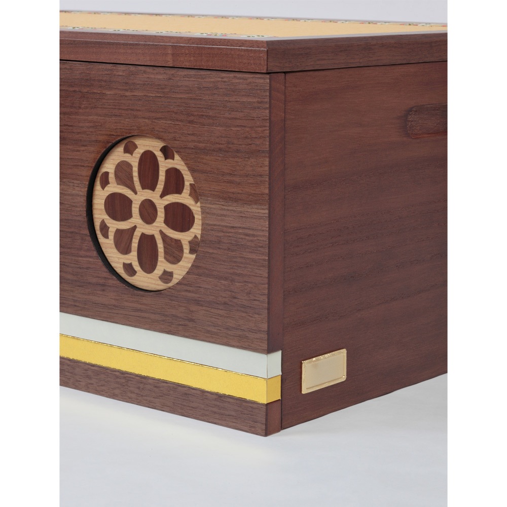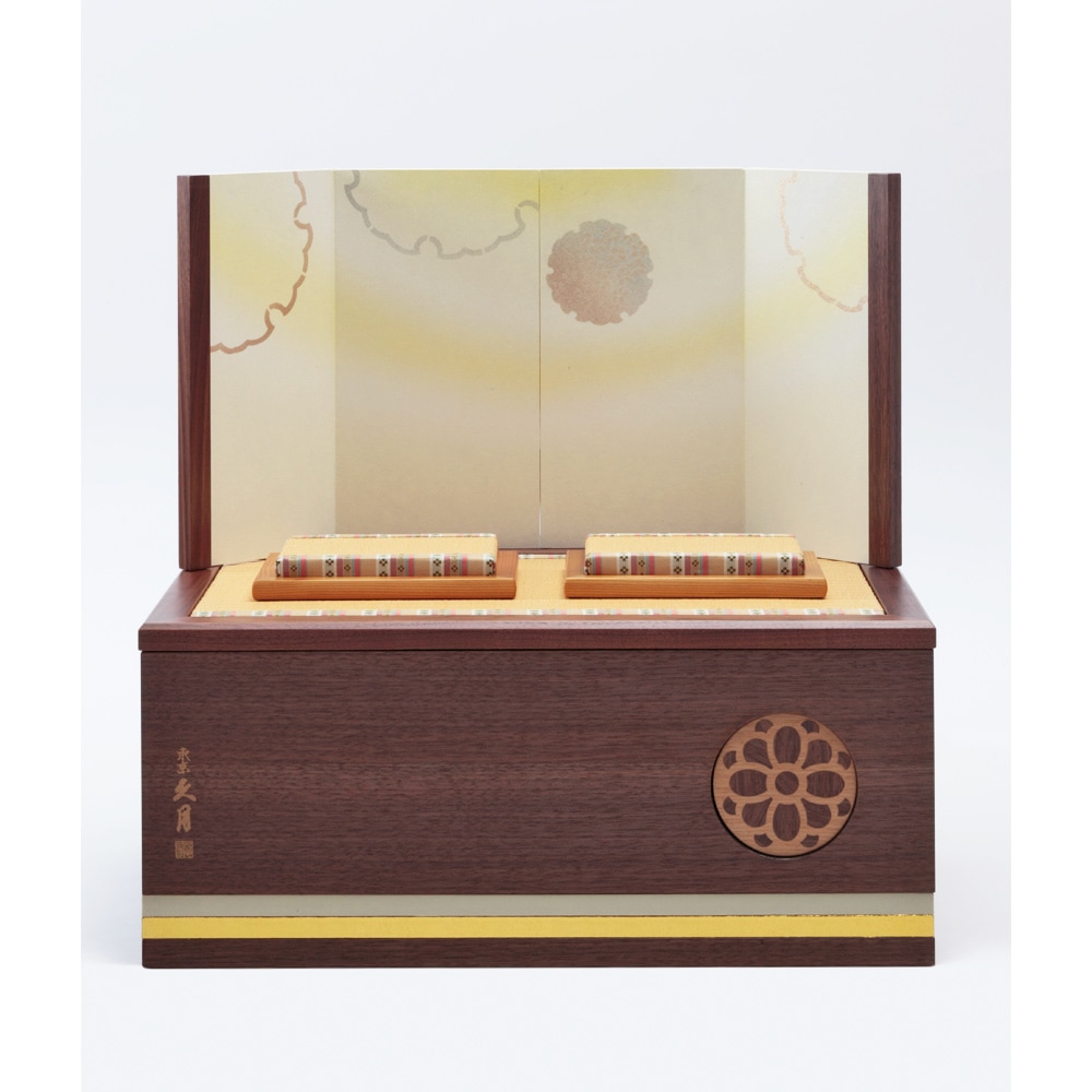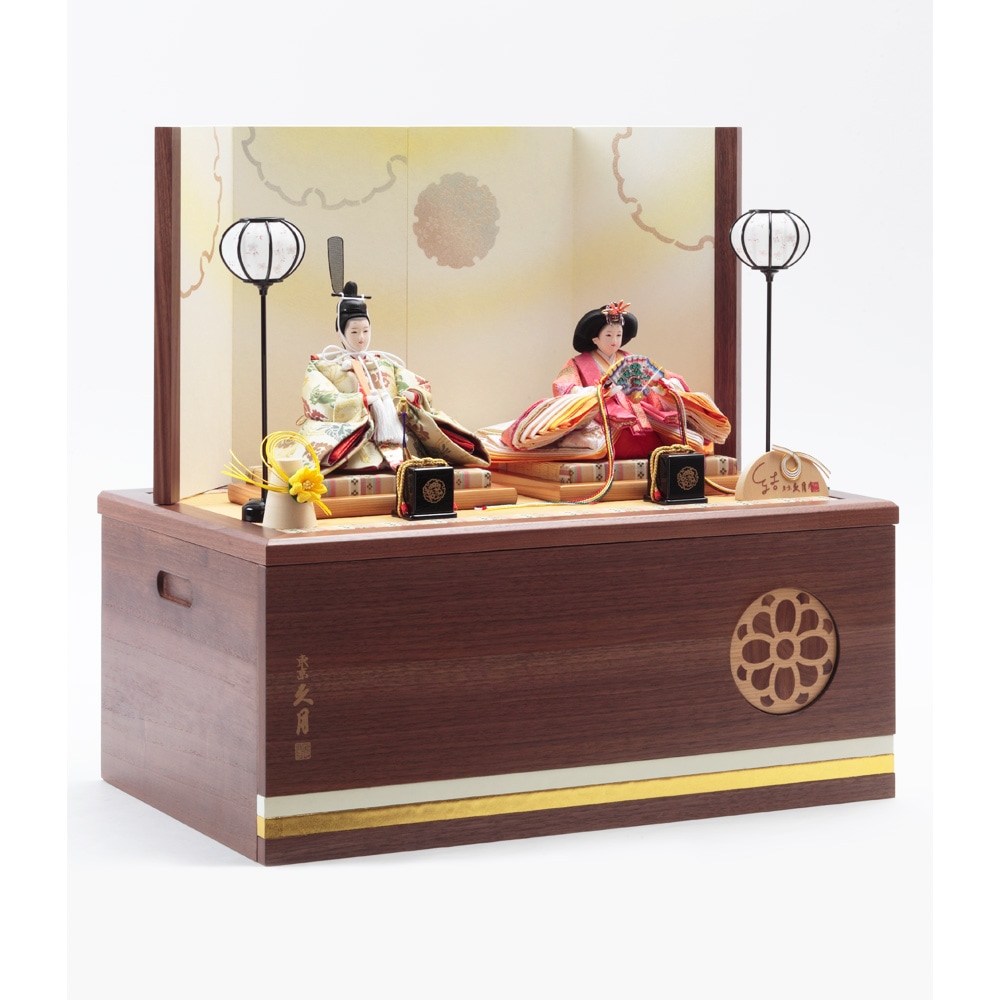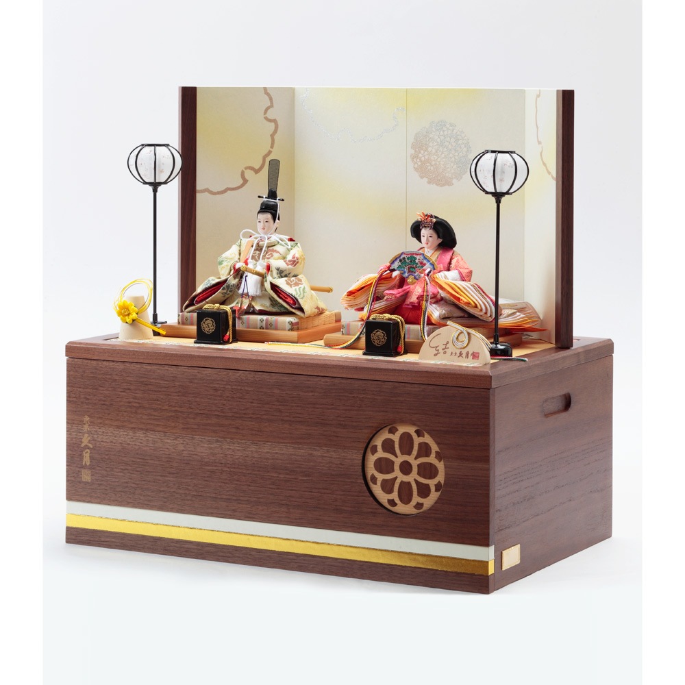 お人形やお道具類の収納ボックスを兼ねた便利な飾り台には、福寿草のモチーフを象嵌であしらったこだわりの仕立ても魅力です。