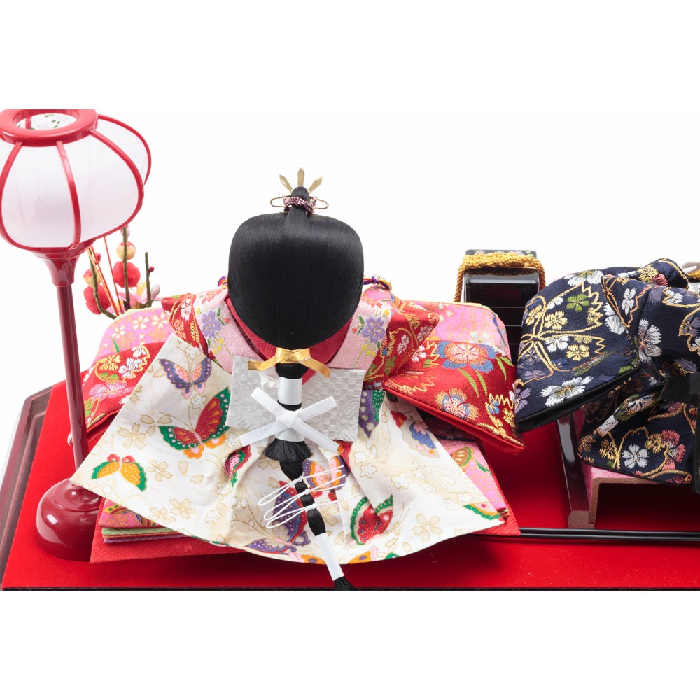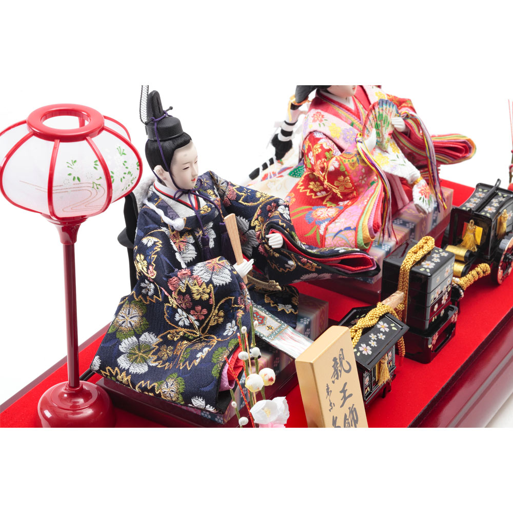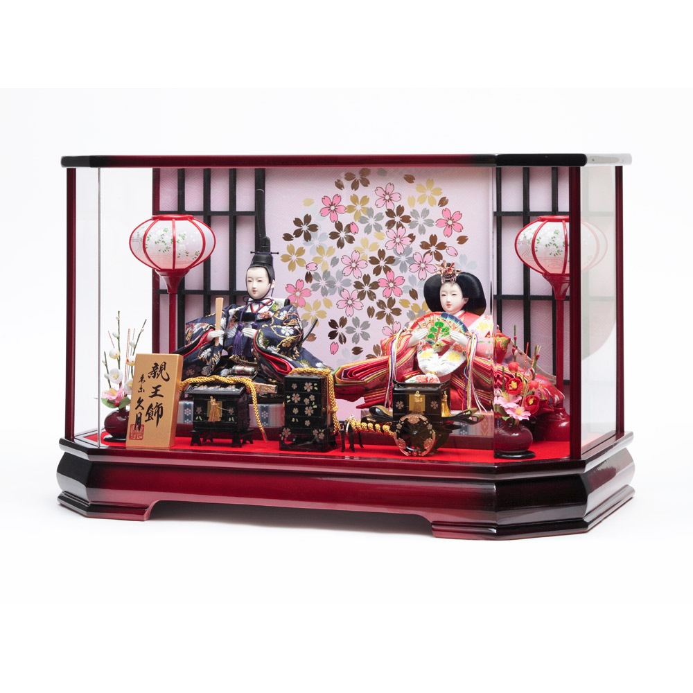 赤と黒の色合いのコントラストが印象的な、スタイリッシュな六角ケース入りの親王飾りです。