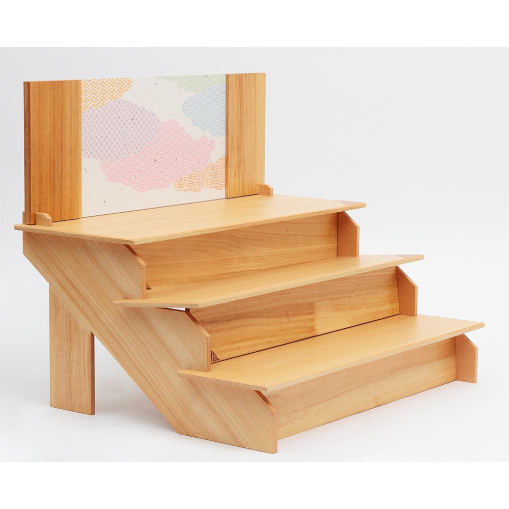 組み立ての容易さを追求したシンプルながらも上品な意匠の折り畳み式の飾り台に、明るく可憐な色彩のお人形が良くマッチする、うららかな春の訪れを感じさせる優美なデザインも特長です。