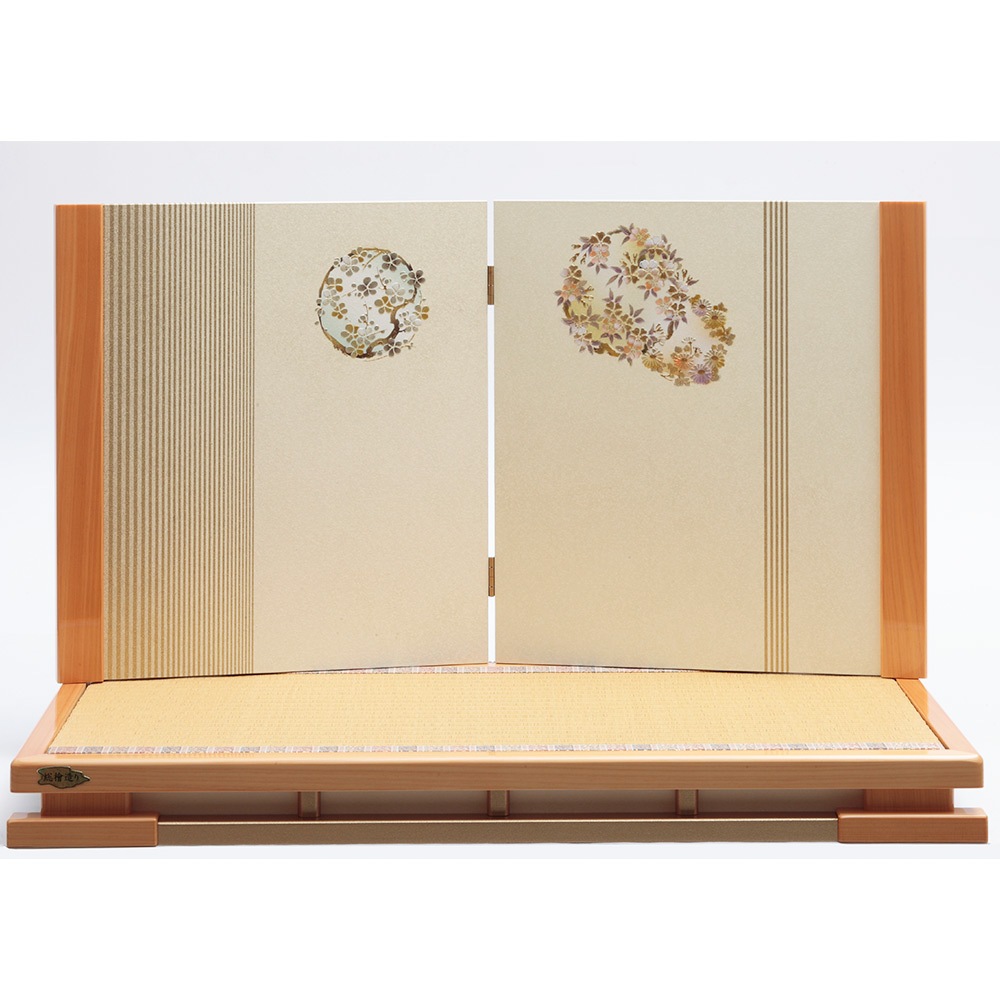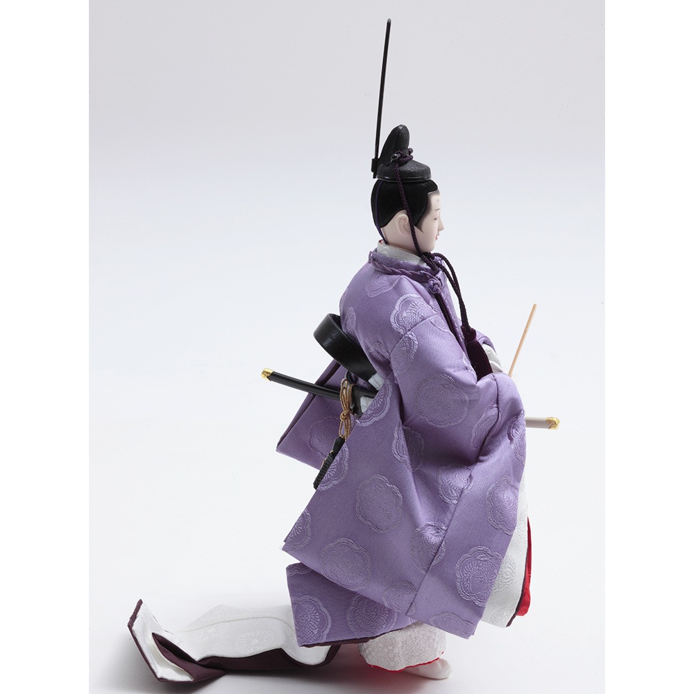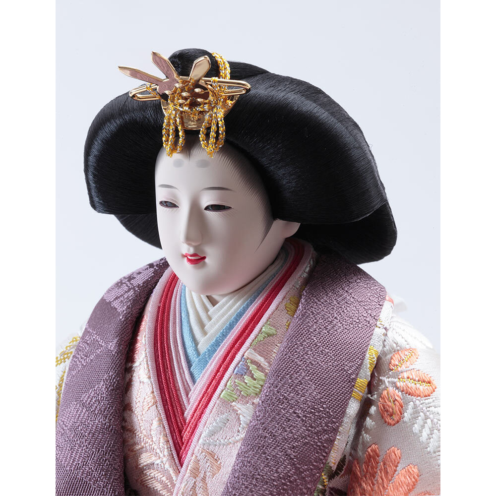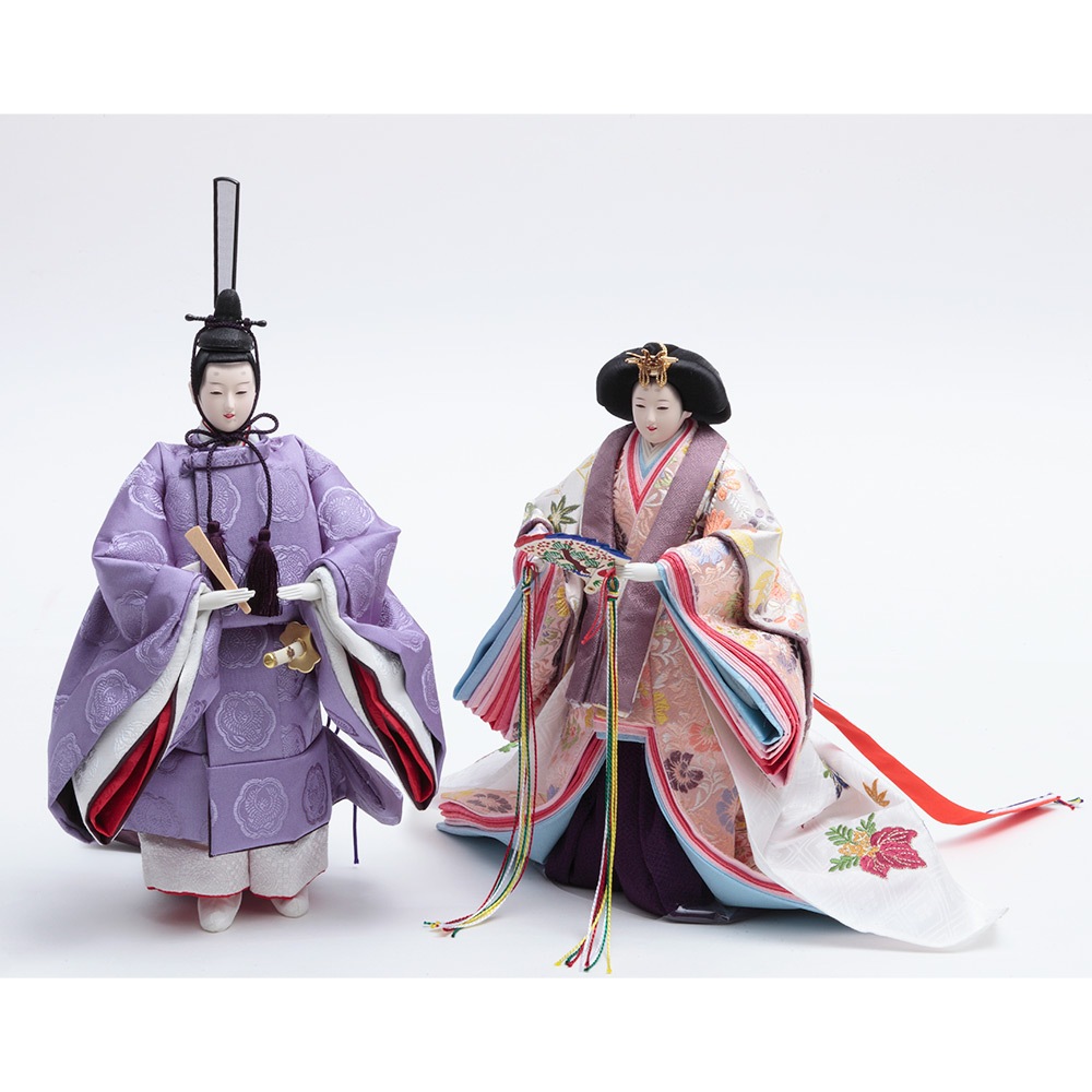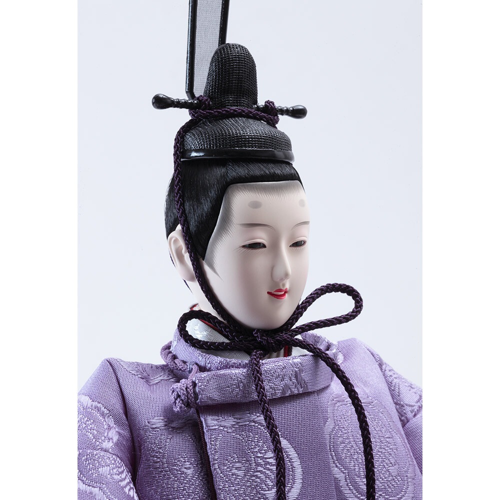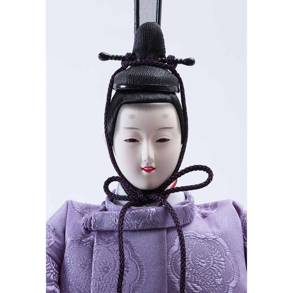 薄紫の上品な色合いのお人形が、檜を使用した高級感のある飾り台と屏風とマッチする、お人形の美しさを堪能出来る立ち姿の親王飾りです。