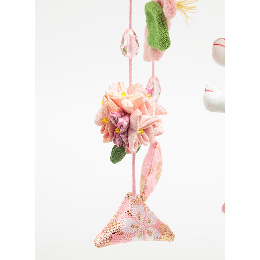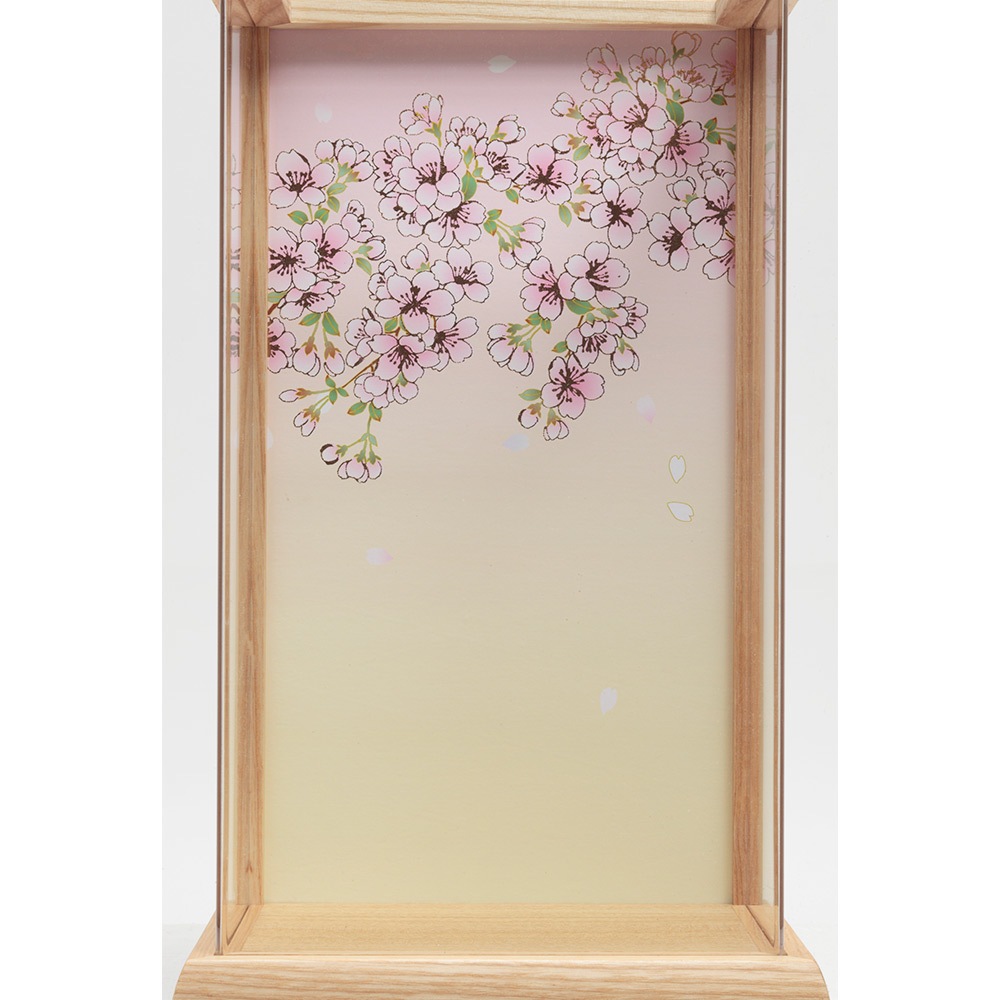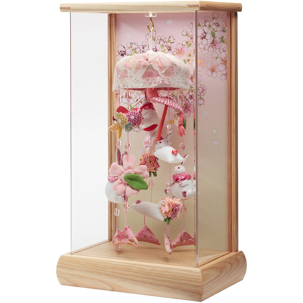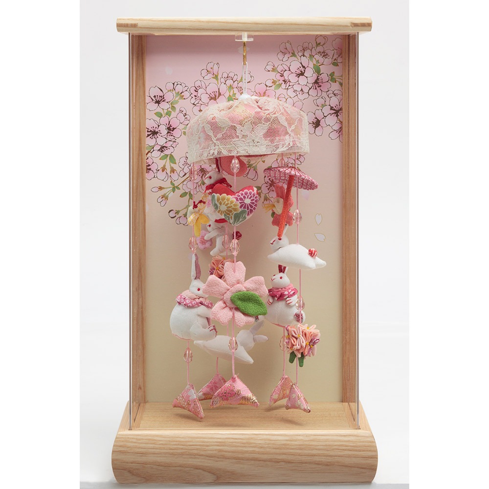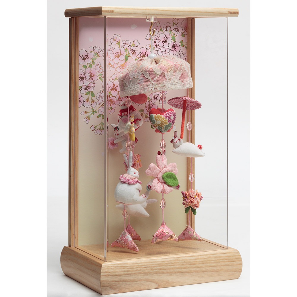 ケース背景に描いた美しい桜の花びらに、愛らしい飾りの数々が見事に映える、春の訪れを感じさせる優美なデザインが素敵な人気のお飾りです。