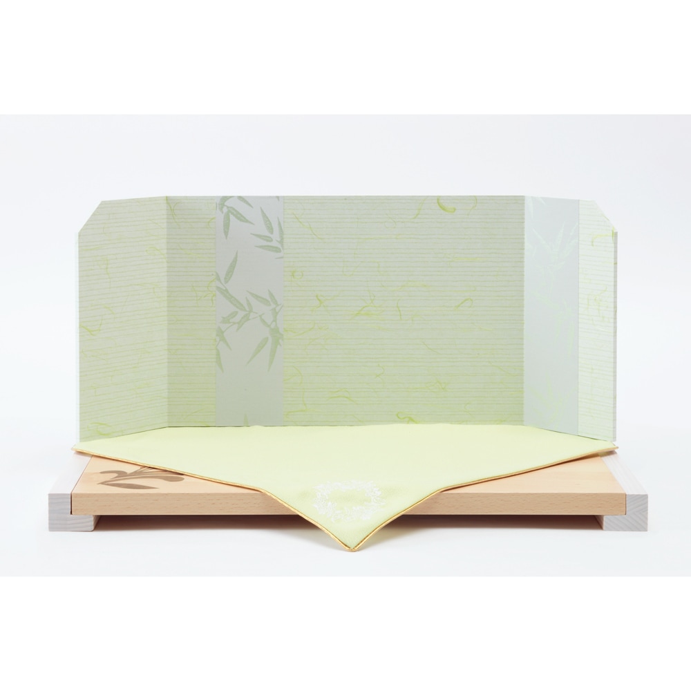 夏の若葉を思わせる鮮やかな色彩の屏風に、色合いを合わせたお人形が見事にマッチします。