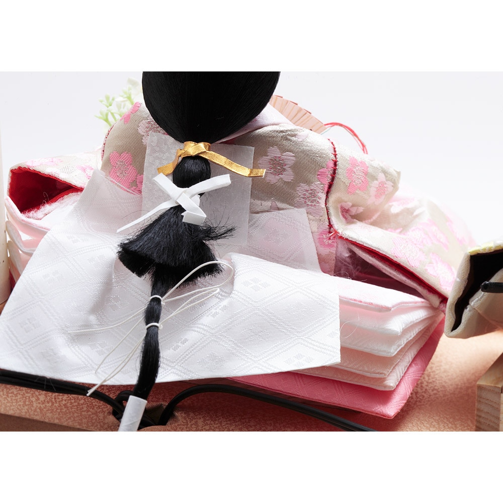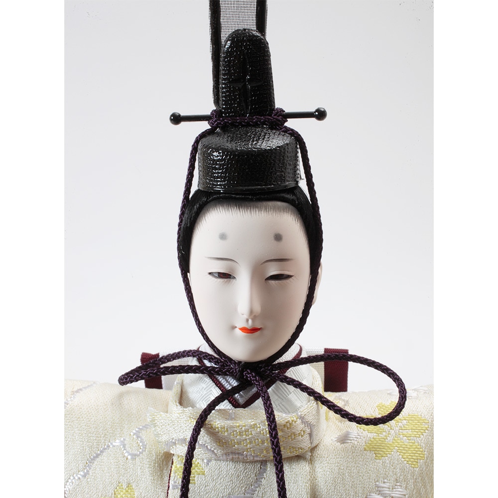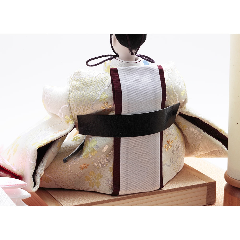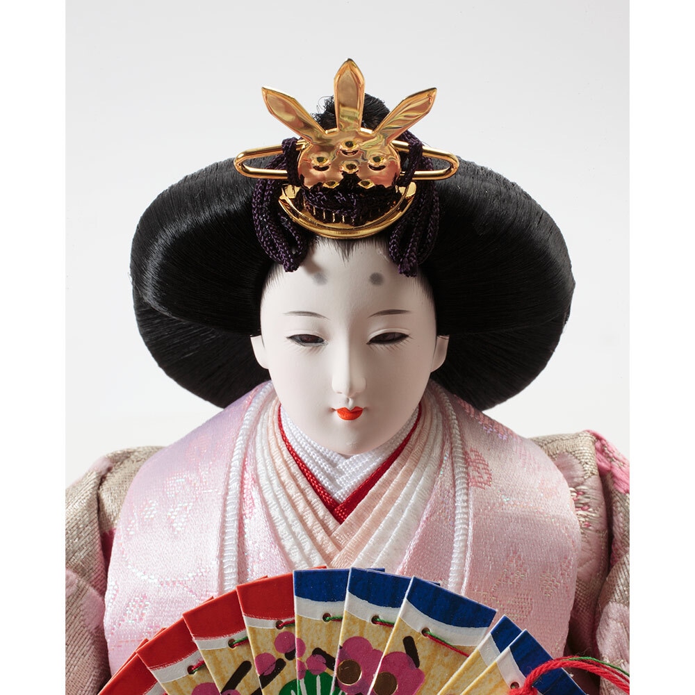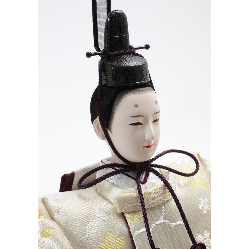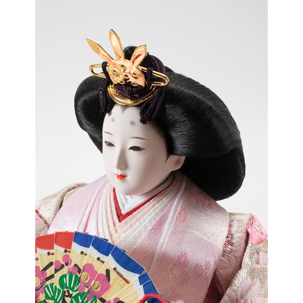 口を閉じて優しく微笑む上品なお人形のお顔立ちが印象的な、春らしい明るい色彩が魅力のおひなさまです。