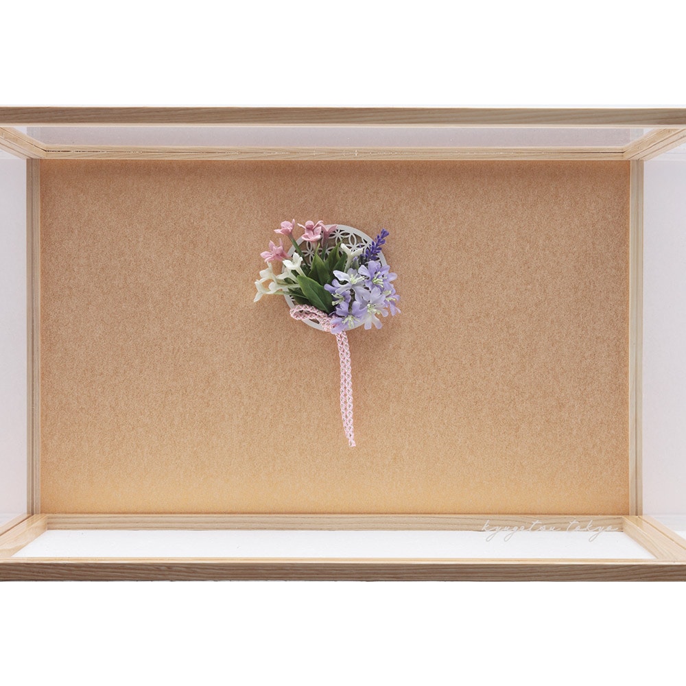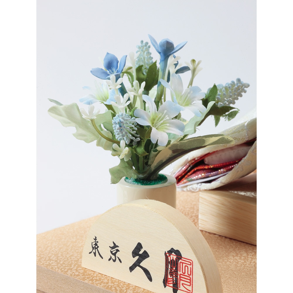 ケース背景にあしらったモダンな雰囲気の洋花飾りが、優美で明るい色合いのお人形を見事に引き立てます。