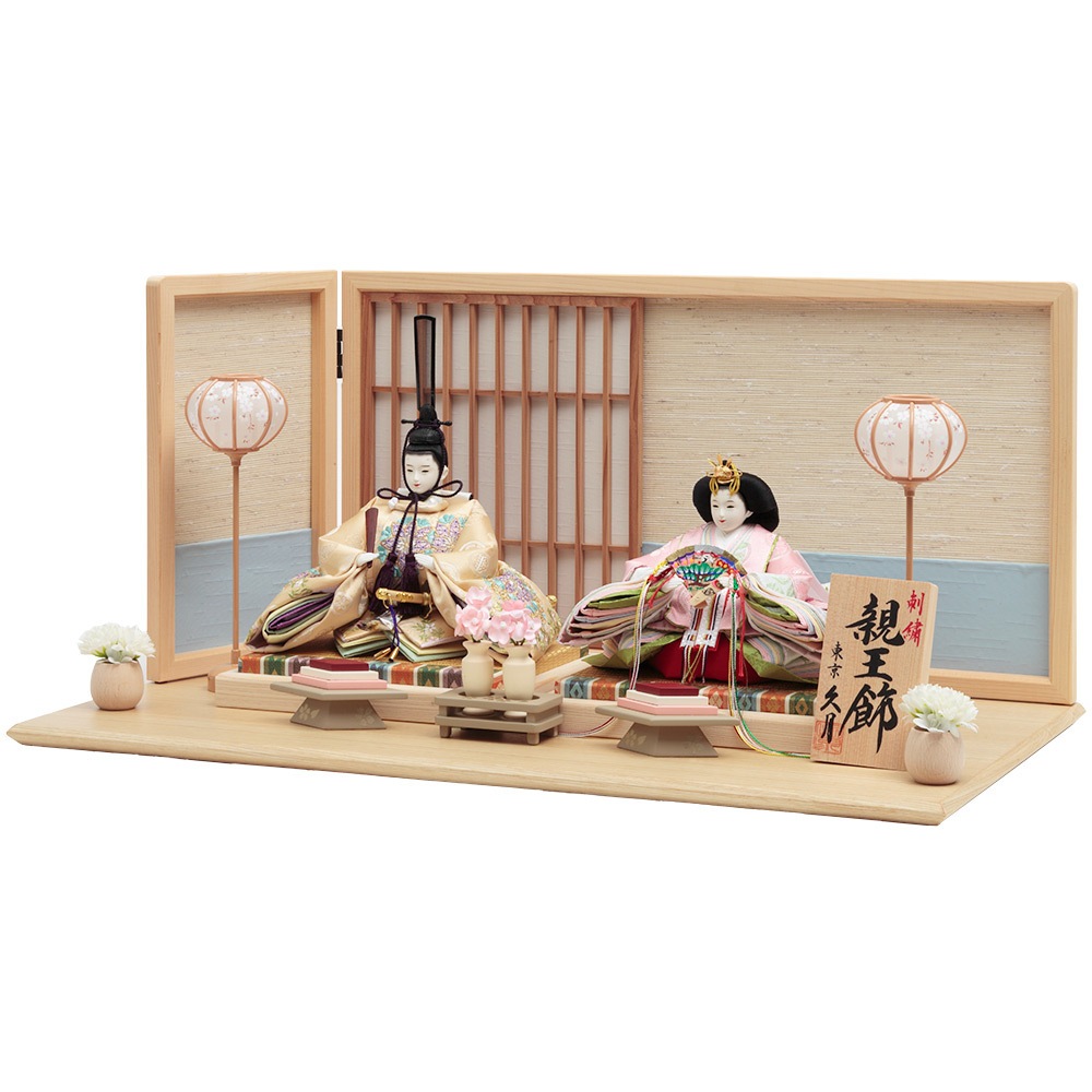 華やかな刺繍を施した明るい色合いの衣裳をまとった男雛と女雛が、上品な木目調の飾り台と屏風に見事に調和します。