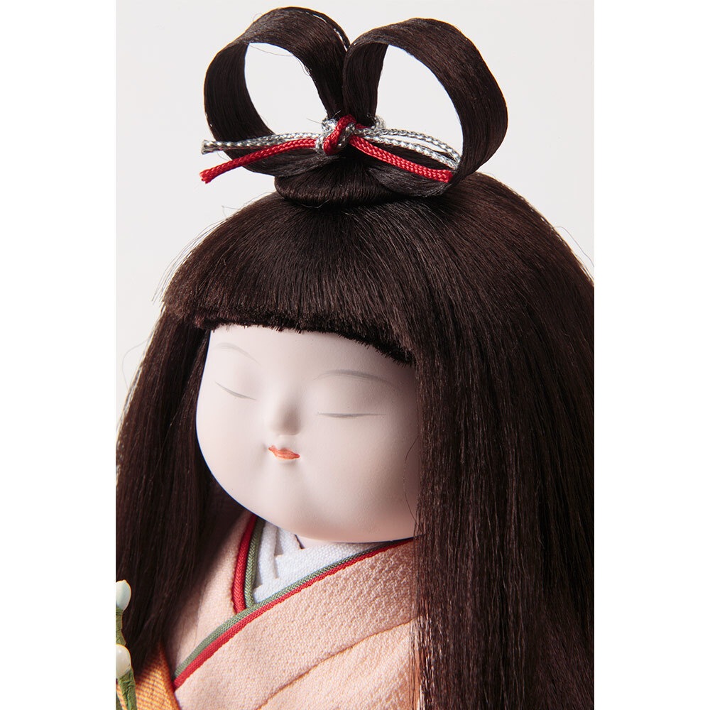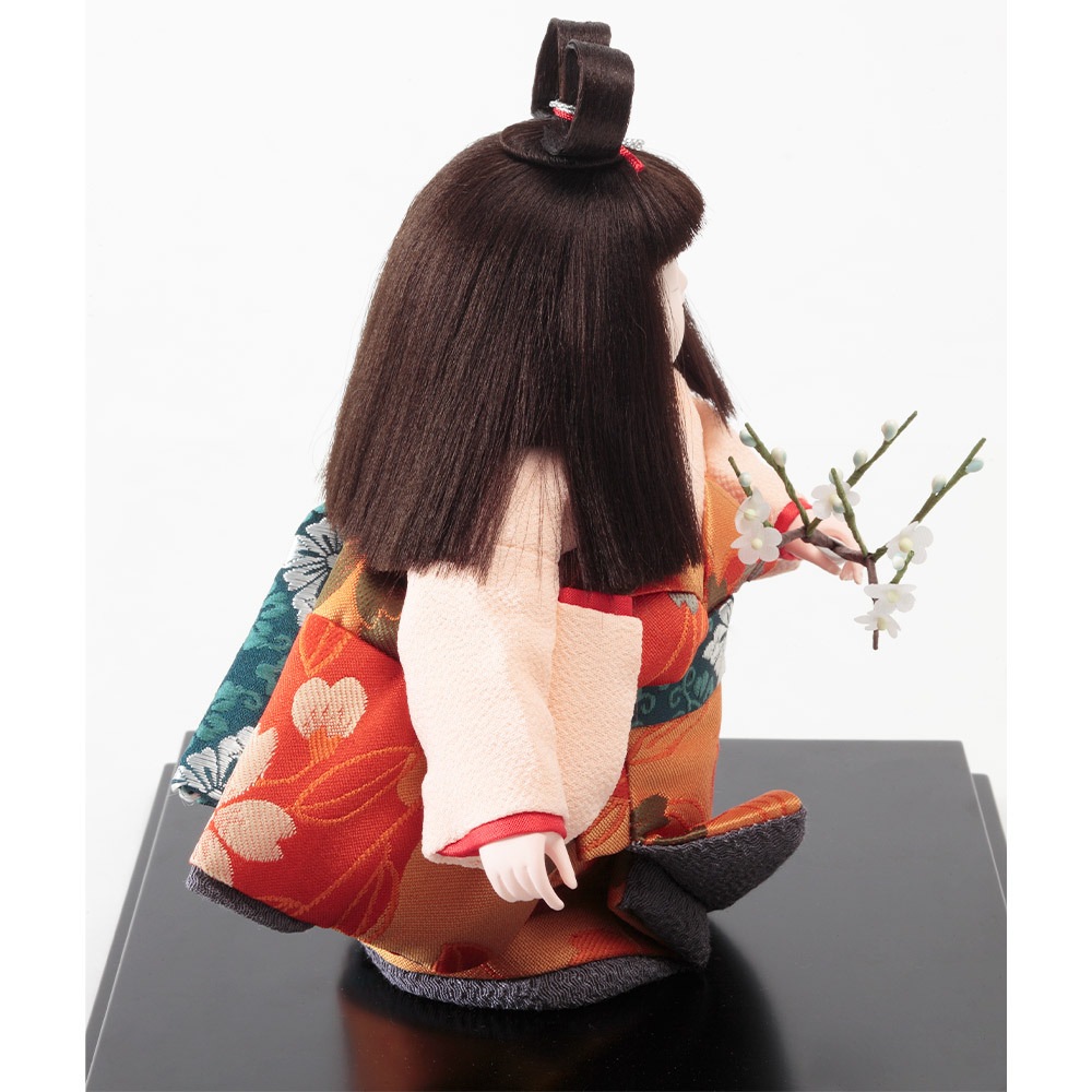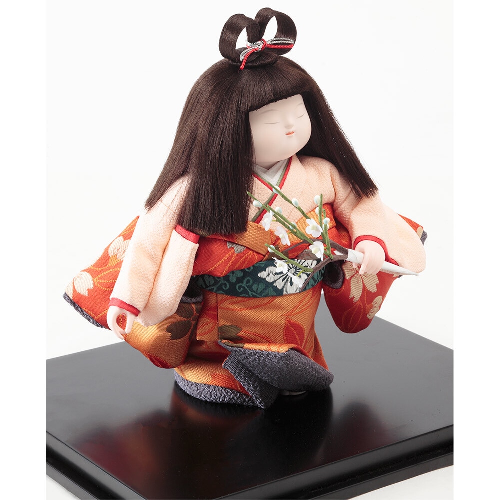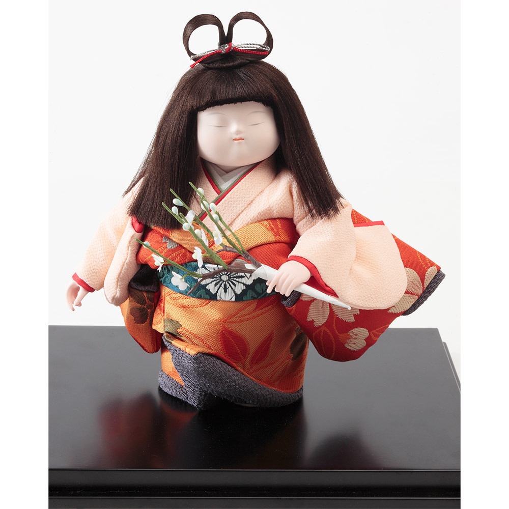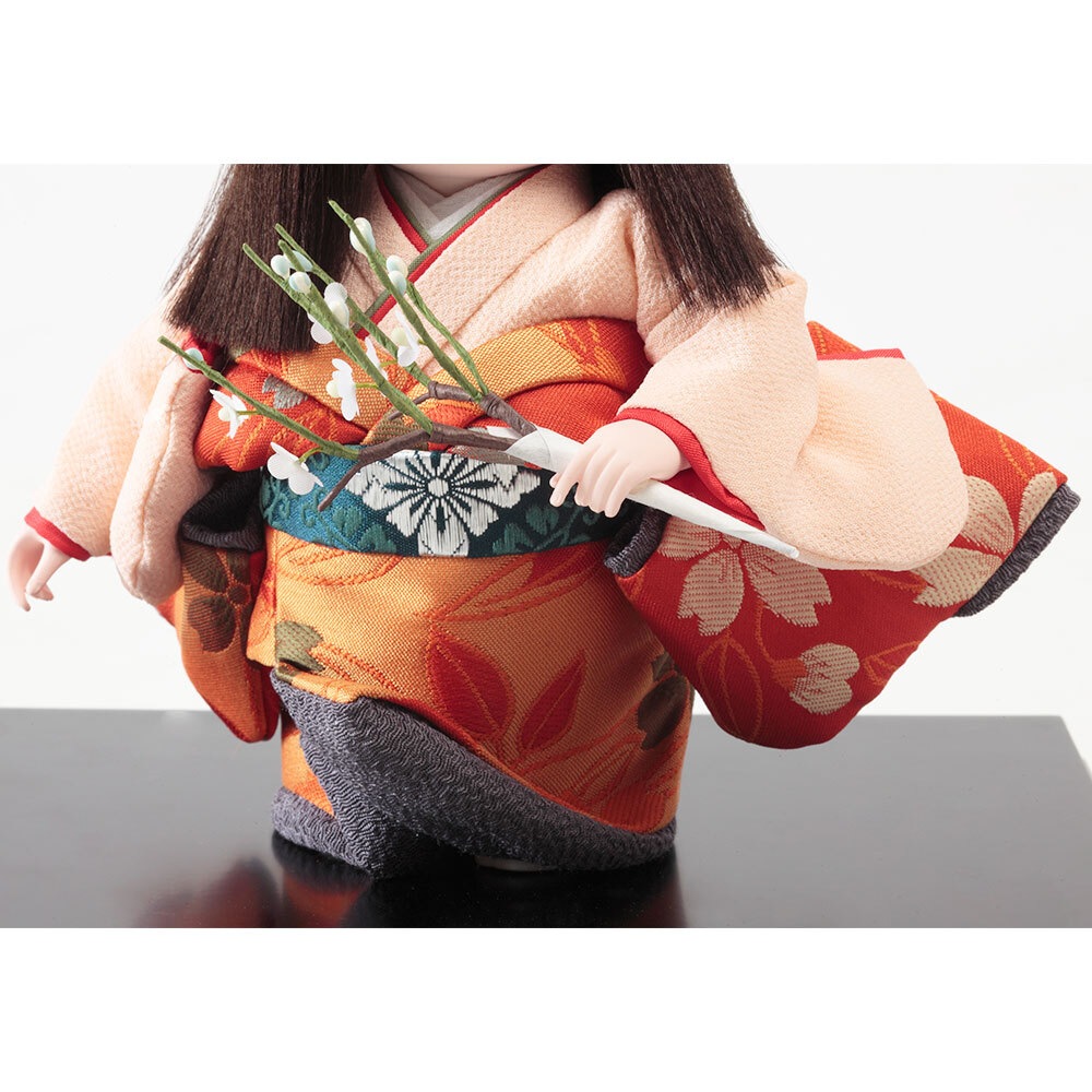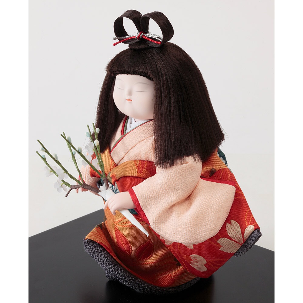梅の花を手に持って愛らしく佇む、純真で優美なお顔立ちが魅力の浮世人形です。